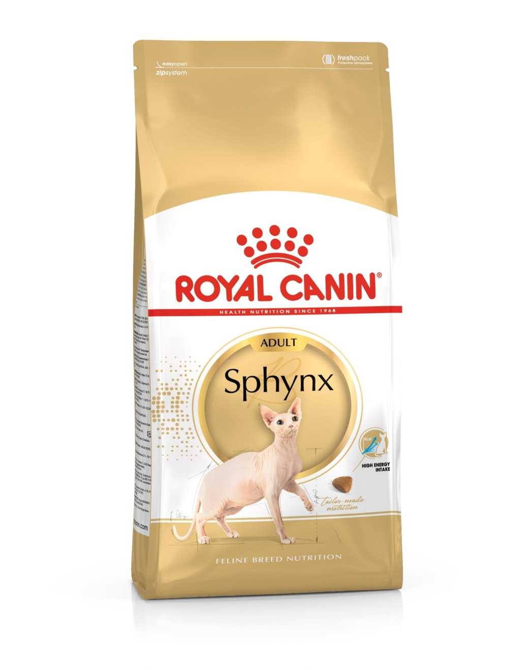 Aby si vynahradili absenciu srsti, mačky sphynx majú veľmi aktívny metabolizmus, ktorý pomáha regulovať telesnú teplotu. Krmivo ROYAL CANIN® Sphynx Adult má zloženie s vysokým obsahom kalórií a zvýšeným obsahom tukov, ktoré uspokoja vyššie energetické potreby tohto plemena. Obsahuje tiež rovnováhu minerálov, ktoré udržuje zdravé močové cesty. Pokožka mačky sphynx je unikátna, pretože je bez srsti, len s jemným páperím. Najdôležitejšiou úlohou kože je fungovať ako bariéra proti vonkajším vplyvom. Mačky sphynx majú hrubú pokožku, ale chýbajúca srsť a pigmentácia zanechávajú kožu nechránenú. Exkluzívny komplex živín v tomto krmive podporuje funkciu kožnej bariéry. Zloženie krmiva je tiež obohatené o omega-3 a omega-6 mastné kyseliny, ktoré udržujú kožu zdravú. Strava má nenahraditeľnú úlohu pri udržiavaní zdravého srdca. Krmivo taktiež obsahuje taurín a EPA a DHA (omega-3 mastné kyseliny), ktoré udržujú zdravú funkciu srdca.