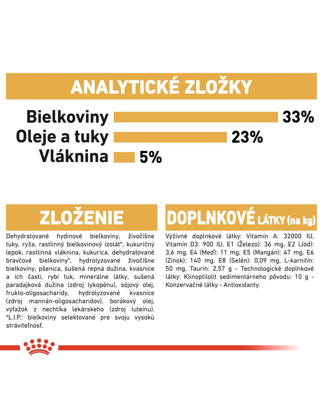Doplnkové látky: Vitamín A: 32000 IU, Vitamín D3: 900 IU, E1 (železo): 36 mg, E2 (jód): 3,6 mg, E4 (meď): 11 mg, E5 (mangán): 47 mg, E6 (zinok): 140 mg, E8 (selén): 0,09 mg, L-karnitín: 50 mg, taurín: 2,57 g. Technologické doplnkové látky: klinoptilolit sedimentárneho pôvodu: 10 g. Konzervačné látky. Antioxidanty.