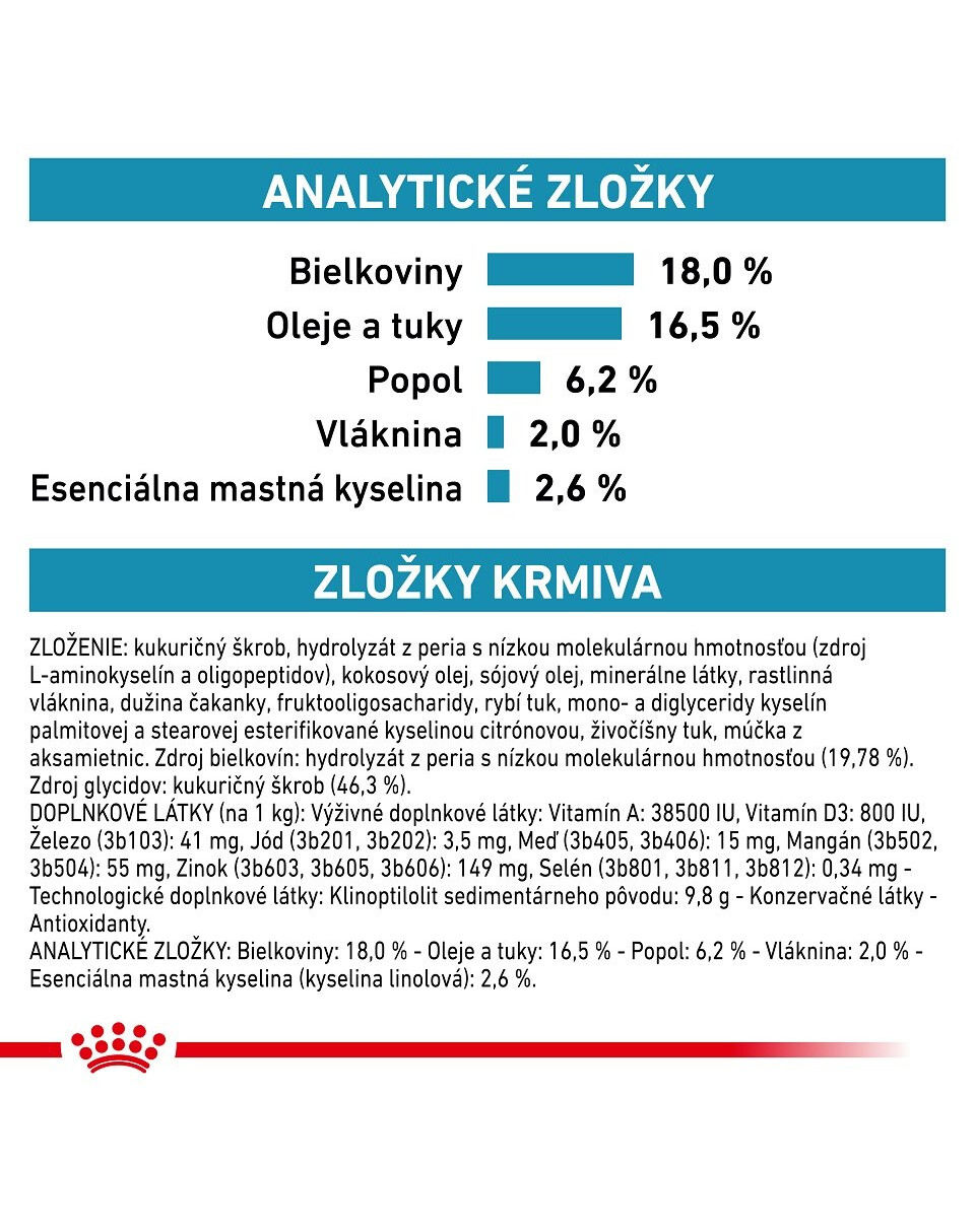 Zloženie: Kukuričný škrob, hydrolyzované bielkoviny z peria s nízkou molekulovou hmotnosťou (zdroj L-aminokyselín a oligopeptidov), kokosový tuk, sójový olej, minerálne látky, rastlinná vláknina, dužina čakanky, frukto-oligosacharidy, rybí tuk, mono a diglyceridy kyseliny palmitovej a stearovej esterifikované kyselinou citrónovou, živočíšne tuky, výťažok z nechtíka lekárskeho (zdroj luteínu). Zdroj bielkovín: hydrolyzované bielkoviny