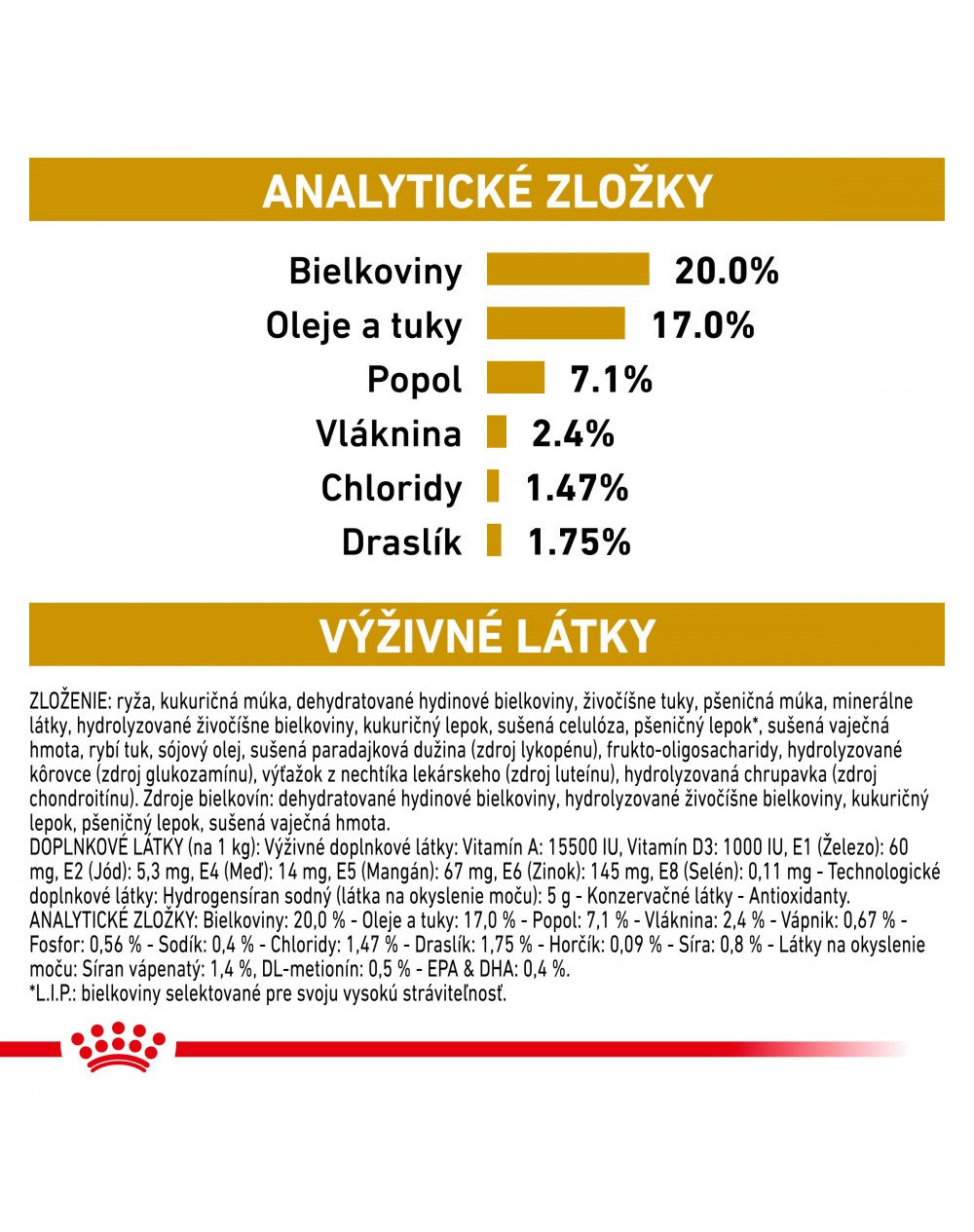 Zloženie: Ryža, kukuričná múčka, dehydratované kuracie proteíny, živočíšne tuky, pšeničná múčka, minerálne látky, hydrolyzované živočíšne proteíny, kukuričný glutén, sušená celulóza, pšeničný glutén, sušená vaječná hmota, rybí tuk, sójový olej, sušená paradajková dužina (zdroj lykopénu), fruktooligosacharidy, hydrolyzované kôrovce (zdroj glukozamínu), výťažok z nechtíka lekárskeho (zdroj luteínu), hydrolyzovaná chrupavka (zdroj chondroitínu). Zdroje proteínov: dehydratované kuracie proteíny, hydrolyzované živočíšne proteíny, kukuričný glutén, pšeničný glutén, sušená vaječná hmota.