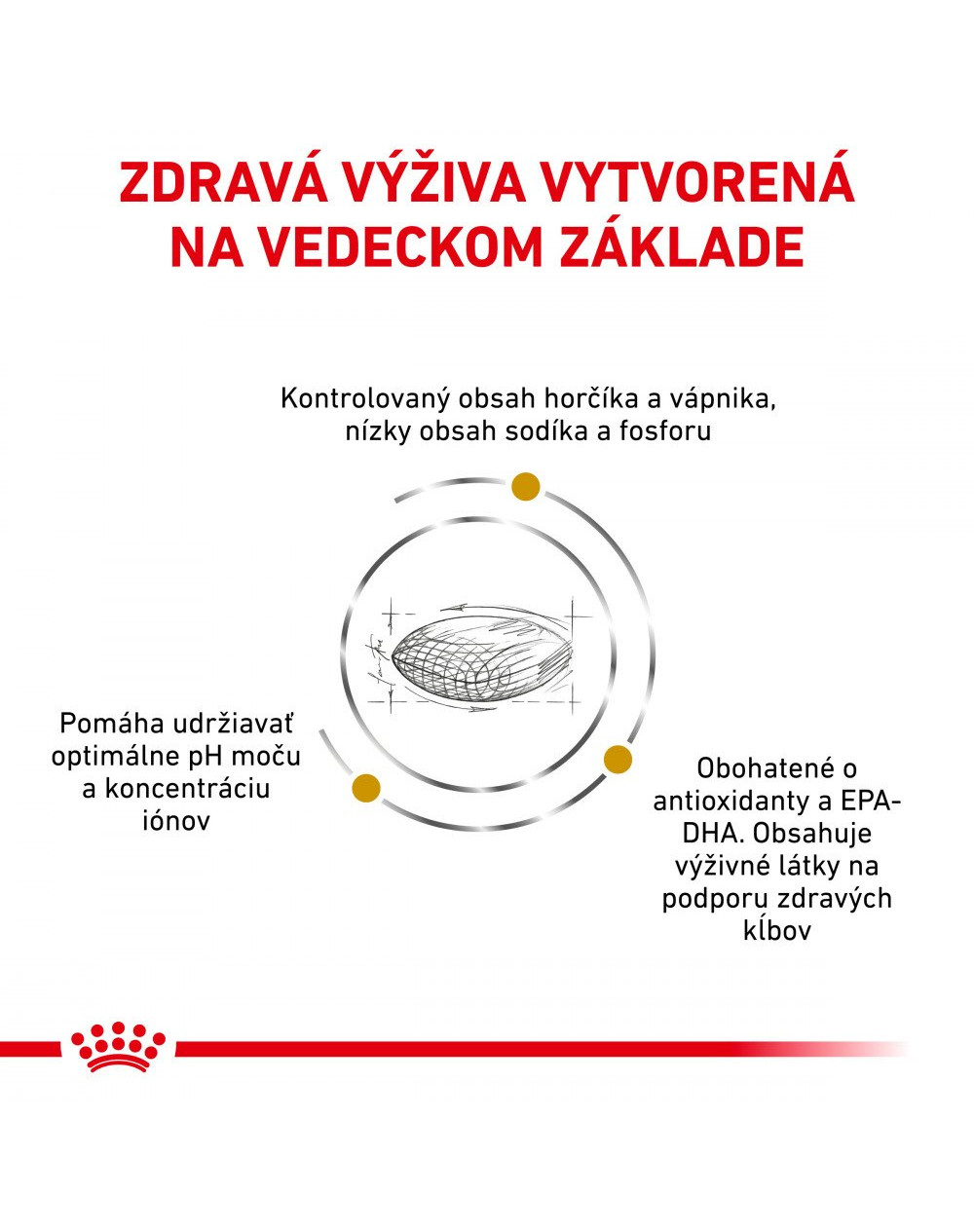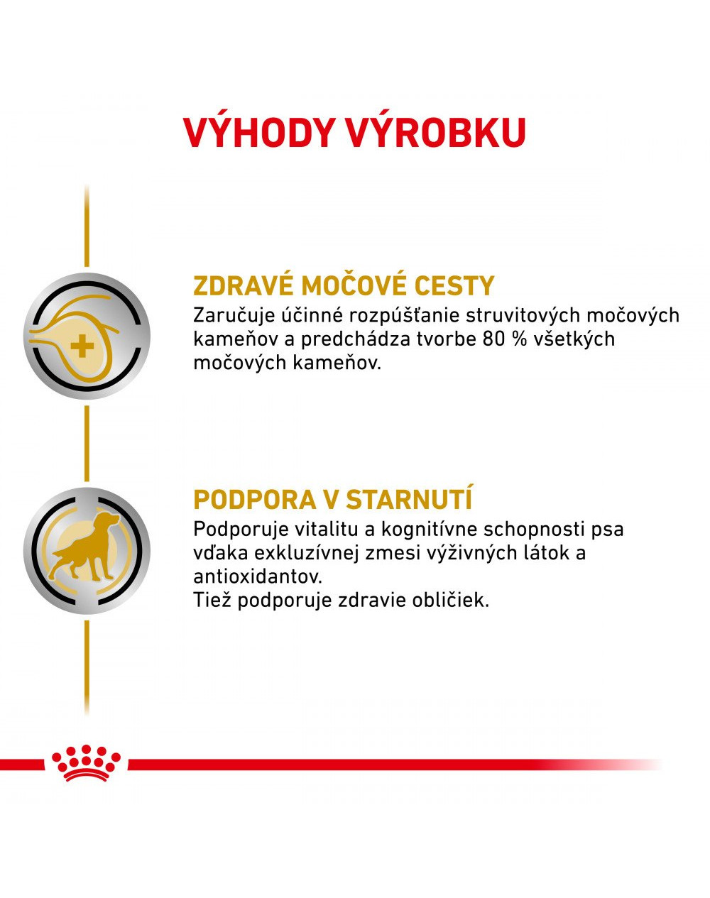URINARY S/O AGEING je kompletné diétne krmivo pre psy pre rozpustenie struvitových kameňov a obmedzenie ich opakovanej tvorby, a to na základe svojej schopnosti okysľovať moč, nízkeho obsahu horčíka a zníženého obsahu proteínov, ktoré sú však vysokej akosti.