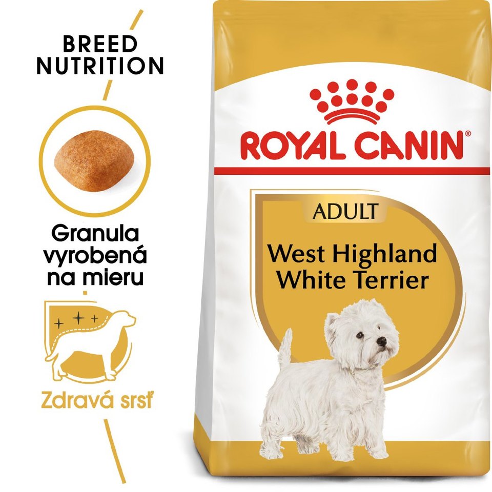 Royal Canin West Highland White Terrier Adult je kompletné superprémiové krmivo pre dospelé (od 10 mesiacov veku) čistokrvné plemeno Westhighlandského bieleho teriéra.