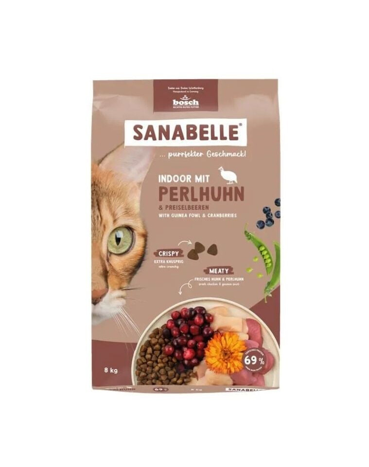 Sanabelle Indoor s perličkou je plnohodnotné suché krmivo vyvinuté špeciálne pre mačky žijúce výlučne v domácnosti. Receptúra bola prispôsobená ich nižšej energetickej potrebe a špecifickým návykom, ako je častejšia starostlivosť o srsť a obmedzená fyzická aktivita.