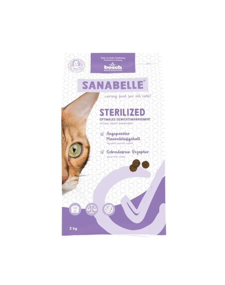 Sanabelle Sterilized je kompletné suché krmivo so špeciálne prispôsobenou receptúrou pre mačky po kastrácii alebo sterilizácii. Po zákroku sa potreby mačky výrazne menia – metabolizmus sa spomaľuje a apetít často rastie. Preto bola táto formula vyvinutá s cieľom zabezpečiť pocit sýtosti pri nižšej kalorickosti, pričom poskytuje všetky potrebné živiny.
