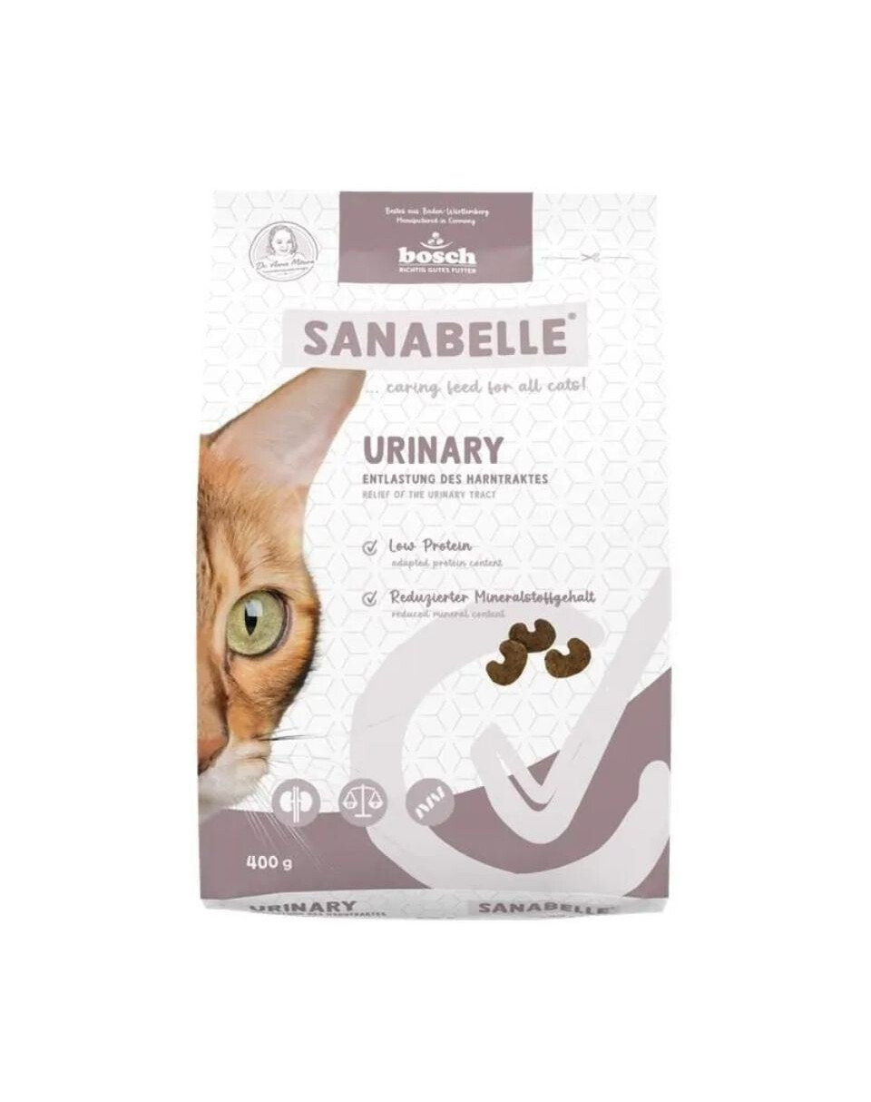 Sanabelle Urinary je špecializované suché krmivo pre dospelé mačky, ktoré potrebujú podporu pri udržaní zdravia močového systému. Vďaka zníženému obsahu vápnika, fosforu a bielkovín produkt odľahčuje obličky a pomáha udržiavať správne pH moču, čo znižuje riziko vzniku močových kameňov.