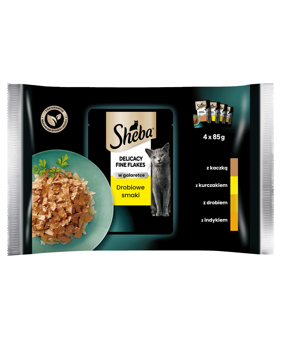 Návrh jedla v 4 chuťových variantoch, kúsky s: kačacinou, kuracím mäsom, hydinou, morčacím mäsom, potešia chuťové bunky aj tých najnáročnejších mačiek. Tajomstvo majstrovskej receptúry Sheba Delicacy Poultry Flavours spočíva vo vysokokvalitných prírodných zložkách a vitamínoch a mineráloch. Každé vrecúško obsahuje živiny, ktoré podporujú správne fungovanie vašej mačky. Sheba® Delicacy Poultry Flavours je lahodná možnosť každodenného varenia, ktorá sa rýchlo stane obľúbeným jedlom vašej mačky.