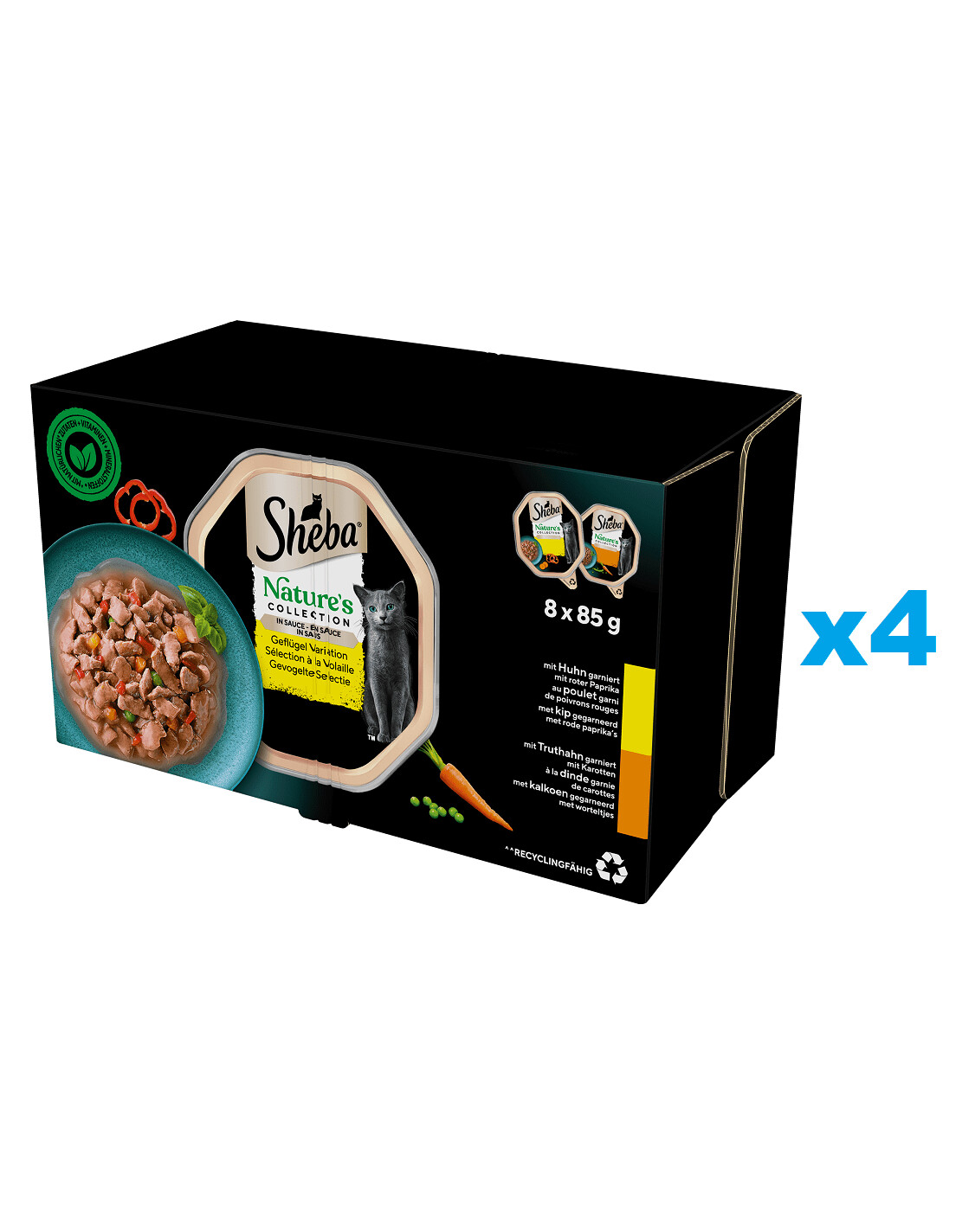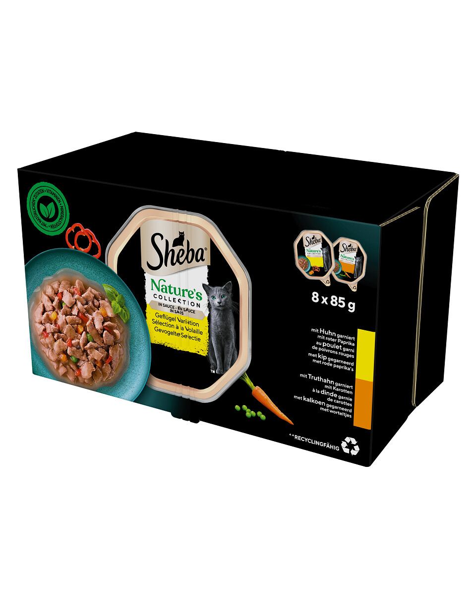 Kolekcia Sheba Nature je zmesou starostlivo vybraných, jemných kúskov v nádhernej omáčke. Návrh jedla v 2 chuťových variantoch, kúsky s: kuracím mäsom zdobeným červenou paprikou, morčacím mäsom zdobeným mrkvou, potešia chuťové bunky aj tých najnáročnejších mačiek.