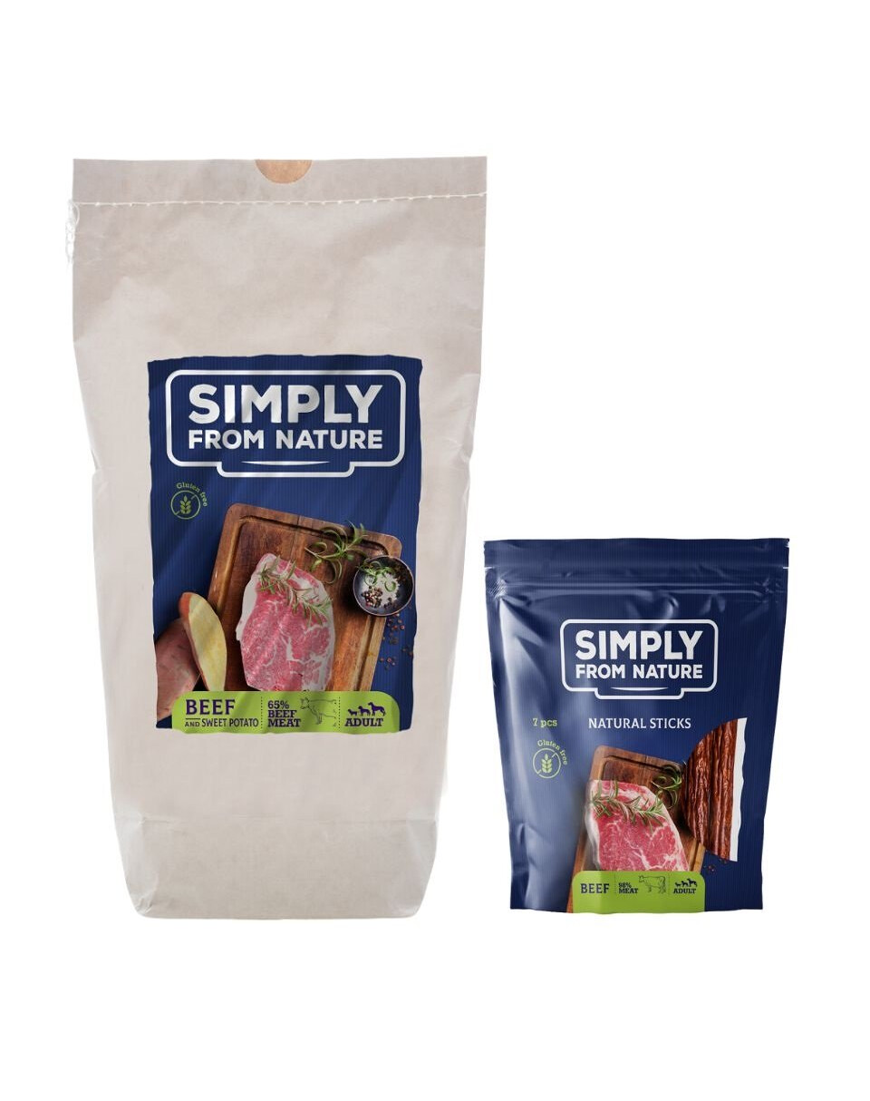 Zloženie: čerstvé hovädzie mäso (svalovina) 42%, sušené hovädzie mäso (svalovina) 23%, sušené sladké zemiaky 12%, sušená tekvica 6%, petržlenová vňať, práškové vajcia, jablká, hrušky, mrkva, rozmarín, ľanový olej, Extrakt šťavy schidigera, fenikel, repná dužina 2%, ryžové klíčky, mleté semená pestreca 1%. Analytické zložky: Surové bielkoviny 31%, Surový tuk 12,7%, Surový popol 5,2%, Surová vláknina 4,8%. Doplnkové látky: vitamín A 12 000 IE, vitamín D3 1 200 IE, vitamín E 240 mg, vitamín C 170 mg, vitamín B1 4,2 mg, vitamínB2 8,4 mg, vitamínB6 5 mg, vitamínB12 50 mikrogramov, biotín 250 mikrogramov, kyselina listová 0,42 mg, niacín 25 mg, kyselina pantoténová 9,6 mg, cholín 1 500 mg