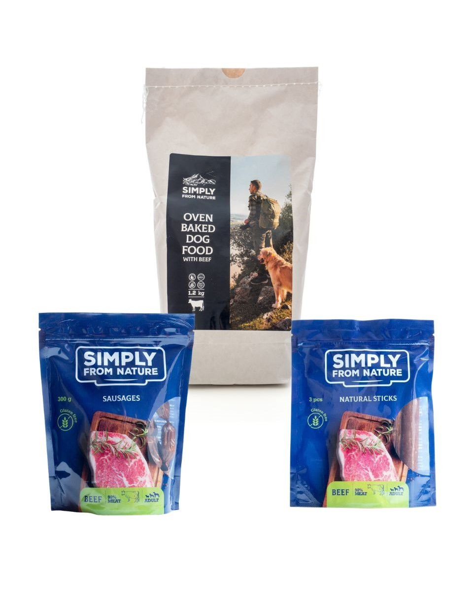 Sada s hovädzím mäsom: suché jedlo 1,2 kg + tyčinky 3 ks + klobásy 300 g