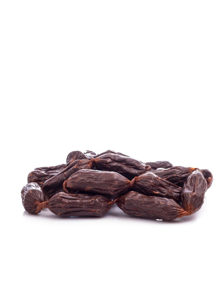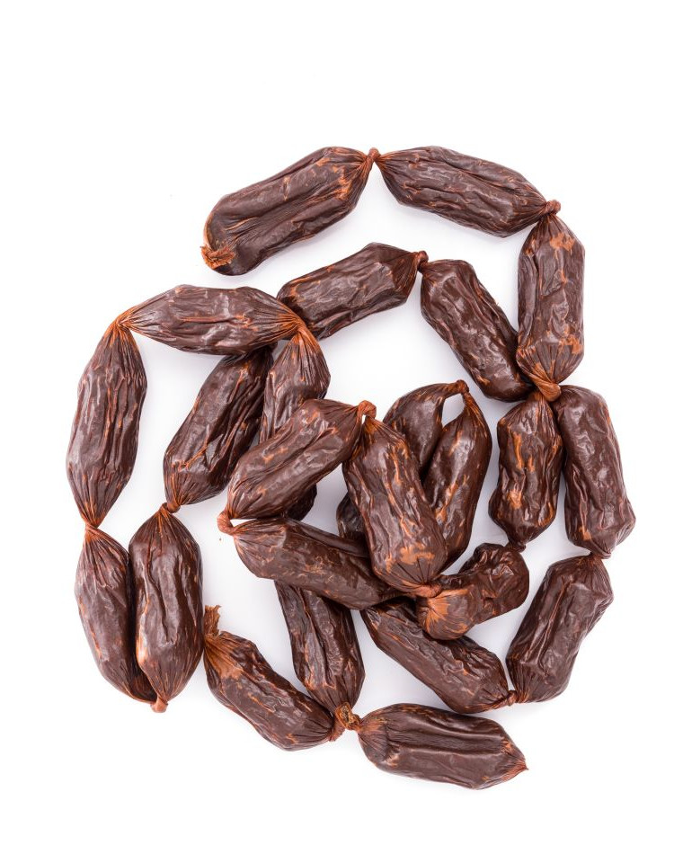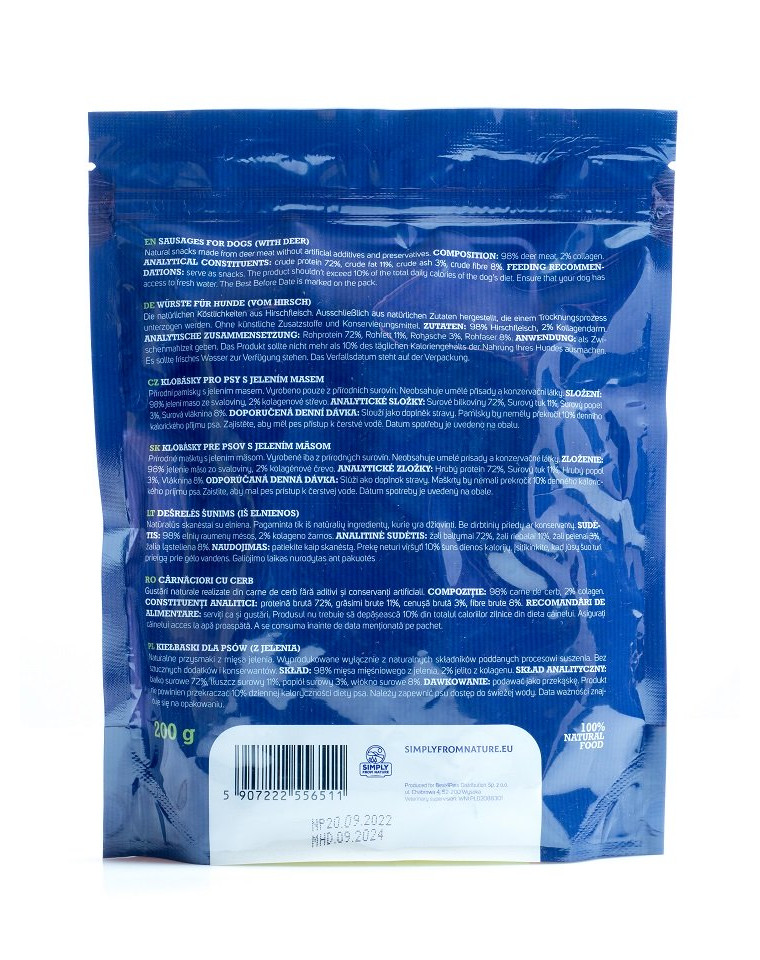 ZLOŽENIE: 96% jelenie mäso zo svaloviny, 4% kolagénové črevo (môže obsahovať stopy hovädzieho mäsa).