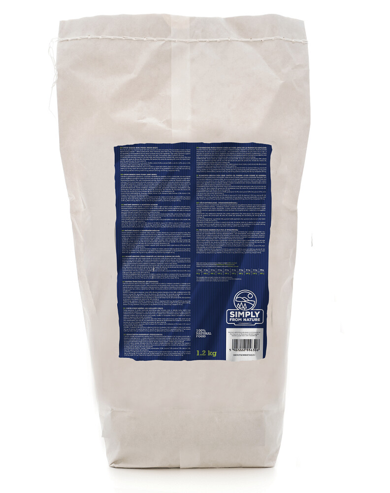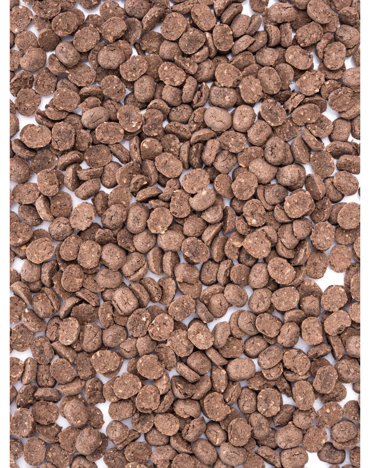 Zloženie: čerstvé hovädzie mäso (svalovina) 42%, sušené hovädzie mäso (svalovina) 23%, sušené sladké zemiaky 12%, sušená tekvica 6%, petržlenová vňať, práškové vajcia, jablká, hrušky, mrkva, rozmarín, ľanový olej, Extrakt šťavy schidigera, fenikel, repná dužina 2%, ryžové klíčky, mleté semená pestreca 1%. Analytické zložky: Surové bielkoviny 31%, Surový tuk 12,7%, Surový popol 5,2%, Surová vláknina 4,8%. Doplnkové látky: vitamín A 12 000 IE, vitamín D3 1 200 IE, vitamín E 240 mg, vitamín C 170 mg, vitamín B1 4,2 mg, vitamínB2 8,4 mg, vitamínB6 5 mg, vitamínB12 50 mikrogramov, biotín 250 mikrogramov, kyselina listová 0,42 mg, niacín 25 mg, kyselina pantoténová 9,6 mg, cholín 1 500 mg