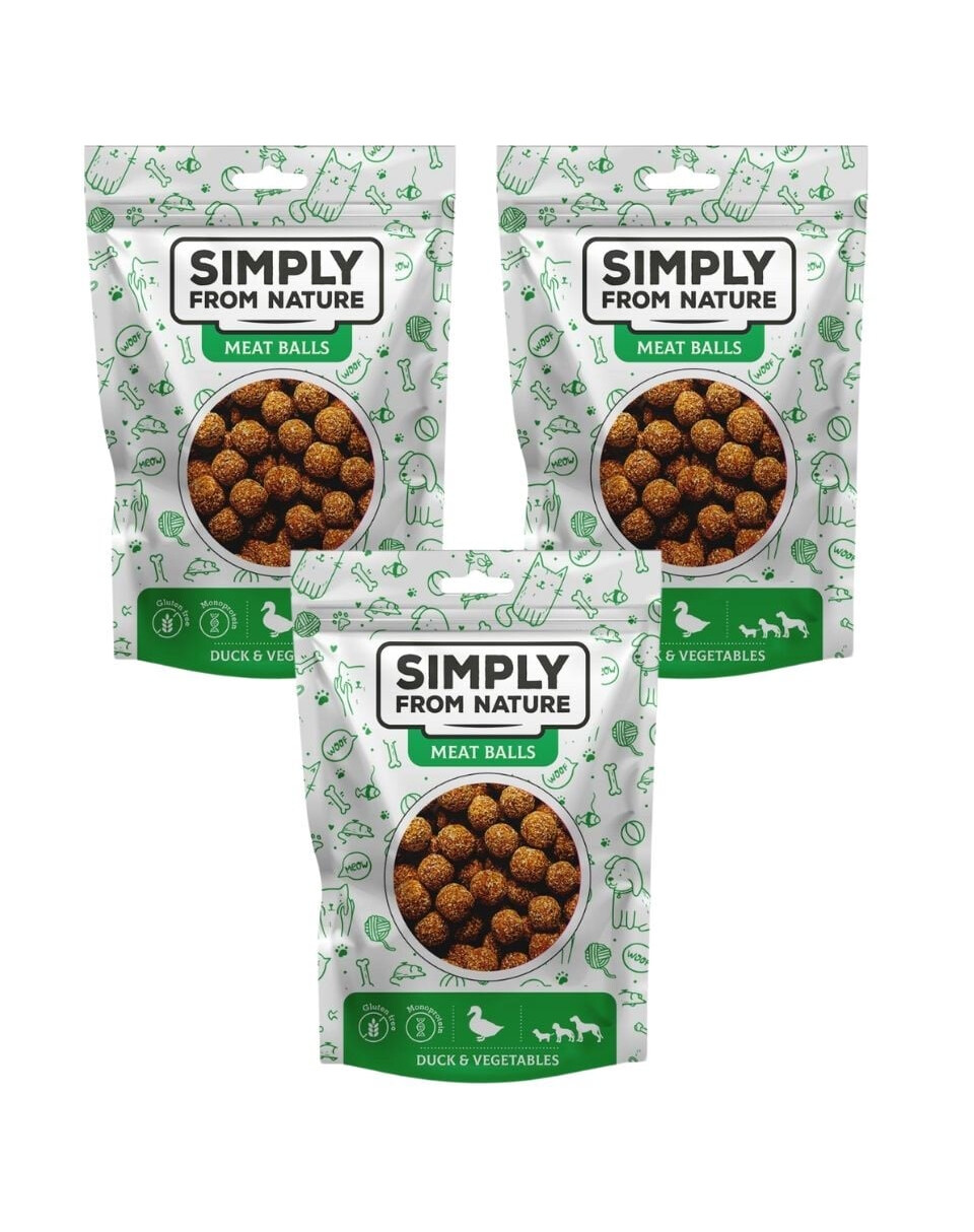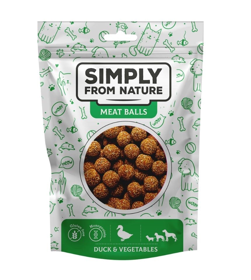 Mäsové guľky Simply from Nature sú doplnkovým krmivom pre psov. Podávajte ako desiatu medzi kŕmeniami. Neprekŕmte.