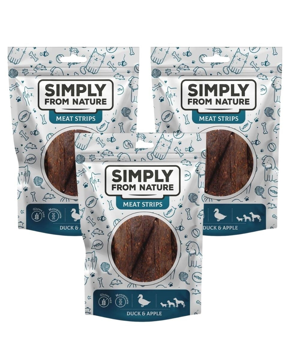 Psie maškrty – stripsy s kačacím mäsom a jablkami. Ideálne na dlhšie žuvanie. Ľahko sa delí na menšie kúsky.