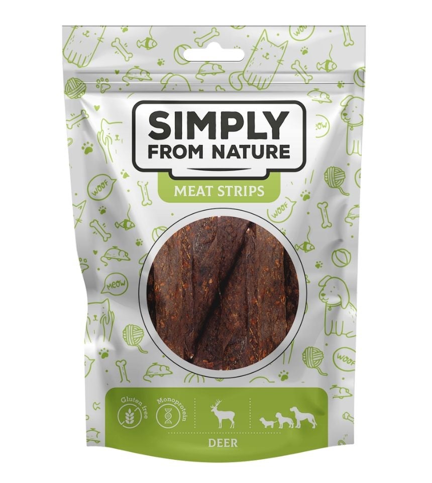Psie maškrty – stripsy s jeleňovým mäsom. Ideálne na dlhšie žuvanie. Ľahko sa delí na menšie kúsky.