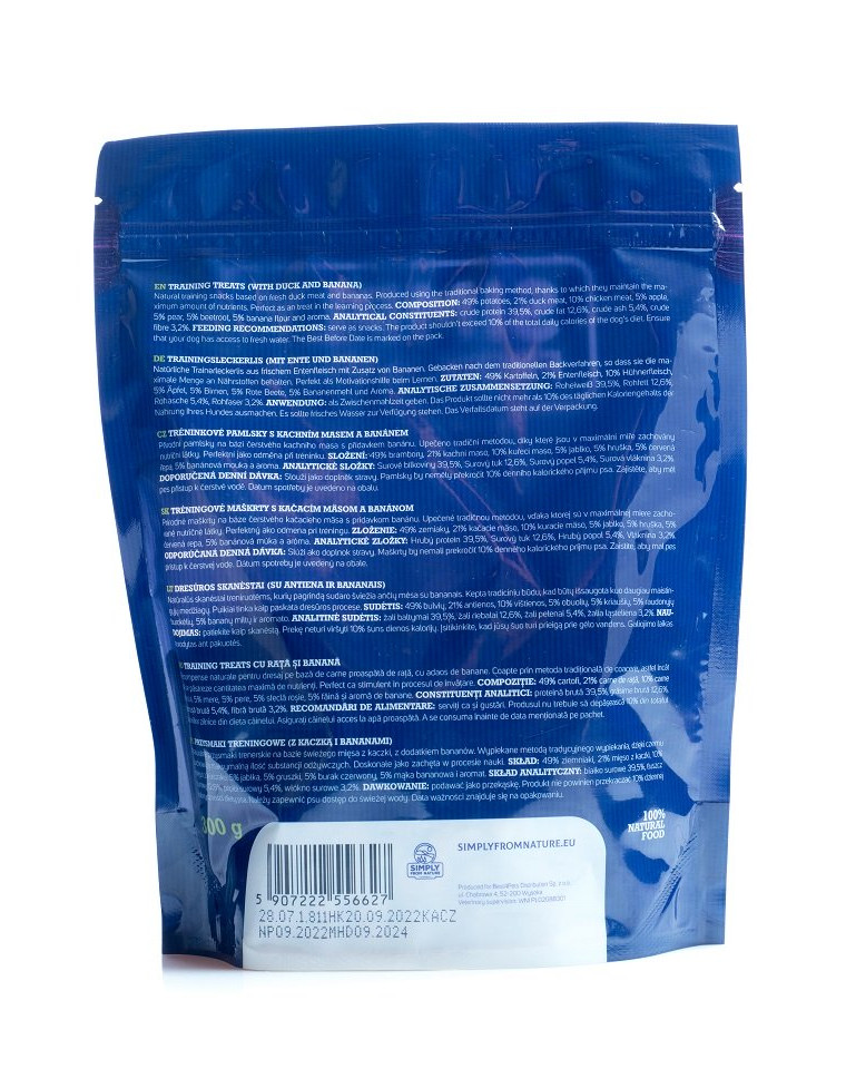 kačacie mäso, 10% kuracie mäso, 5% jablko, 5% hruška, 5% červená repa, 5%