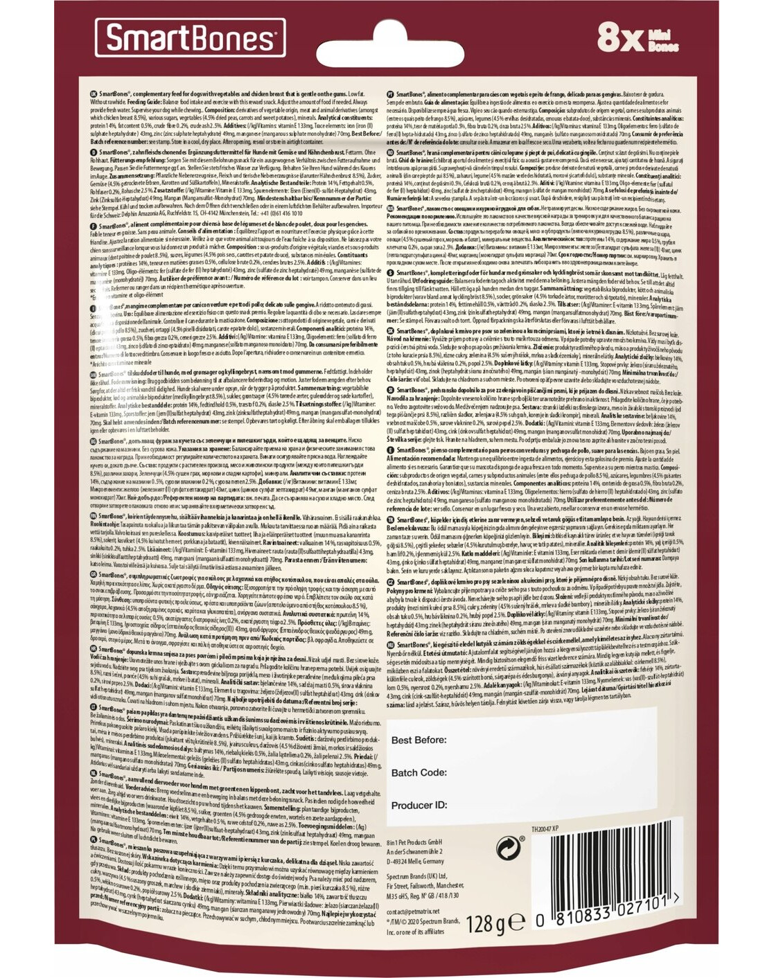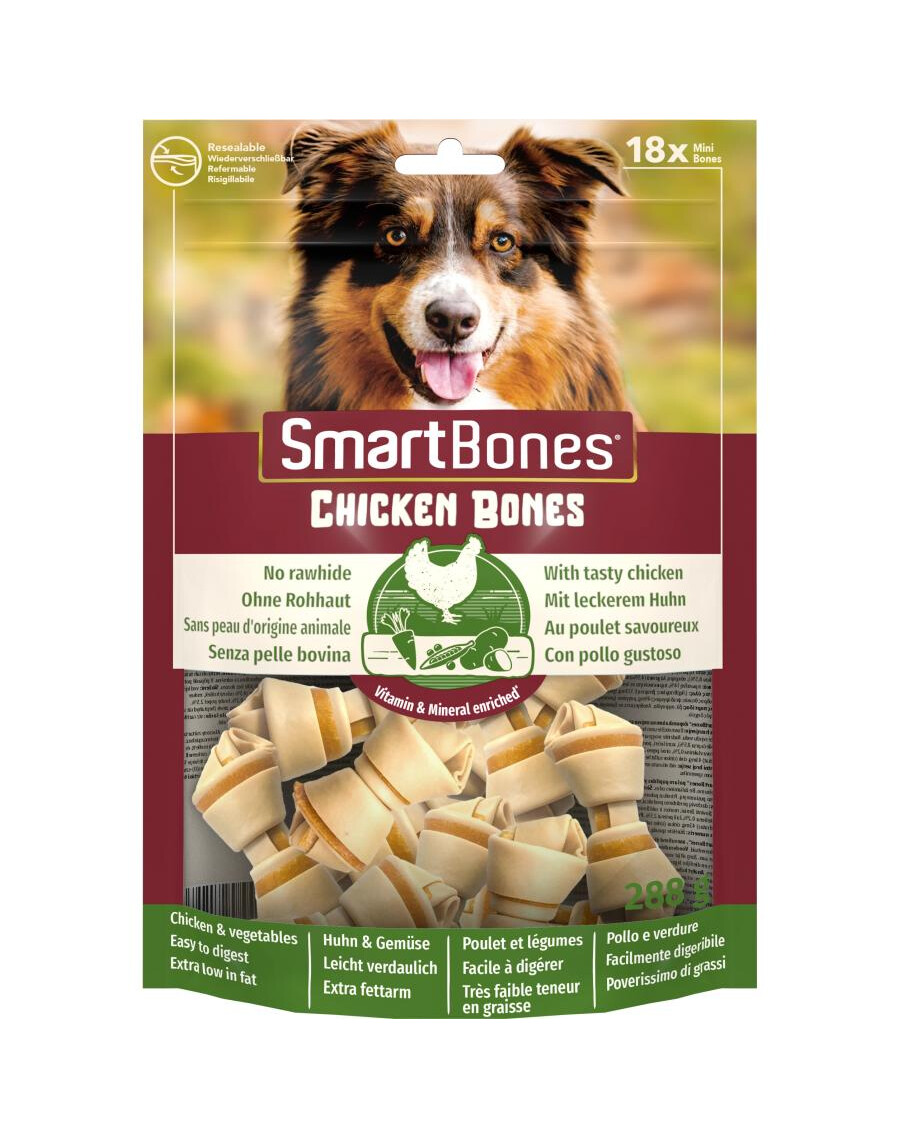 Chutné SmartBones® s kuracím mäsom bez kože (bez surovej kože) je kombináciou dvoch vrstiev, vnútro z lahodného kuracieho mäsa a vonkajšok zo zeleniny. Táto veľká maškrta pre psov je ľahko stráviteľná a má veľmi nízky obsah tuku (0,5 %).