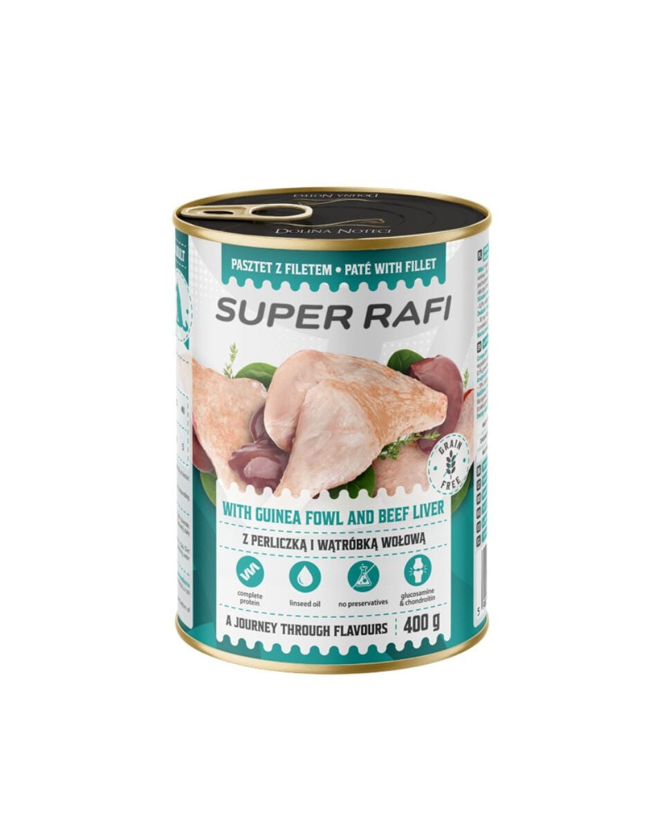 Super RAFI Paštéta s Morčacím Filetom, Perličkou a Hovädzou Pečeňou – Kompletné krmivo pre dospelých psov všetkých plemien