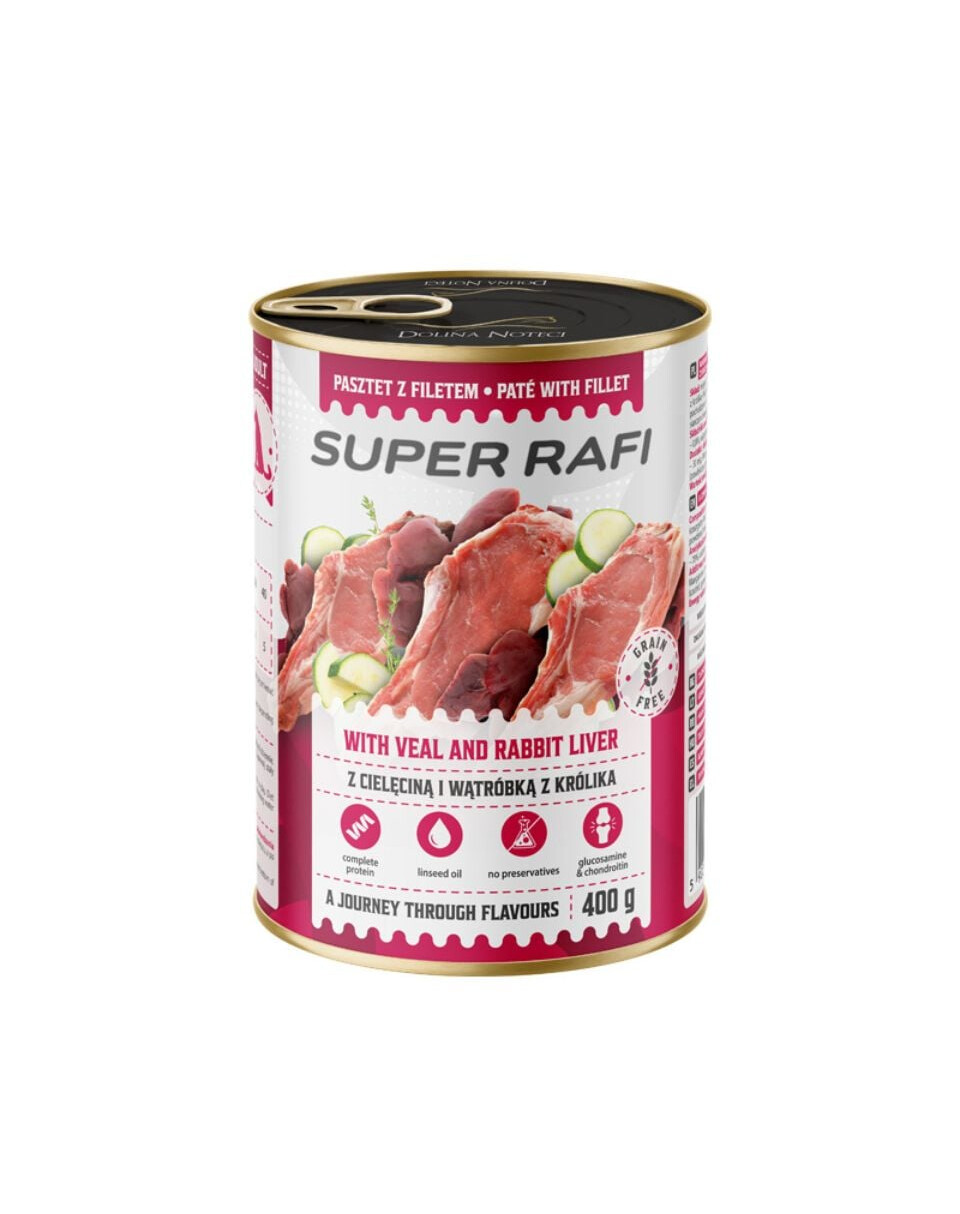 Hľadáte plnohodnotné krmivo, ktoré uspokojí všetky potreby vášho dospelého psa? Zvoľte Super RAFI – paštéta s morčacím mäsom, teľacím mäsom a králičou pečeňou! Je to kvalitné, ľahko stráviteľné krmivo vo forme chutnej paštéty, pripravené špeciálne pre dospelé psy všetkých plemien.