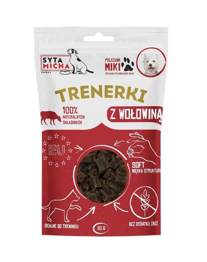 Aromatické a mäkké tréningové maškrty pre psov vhodné pre každé životné obdobie. Trénerky s hovädzím mäsom od značky Syta Micha sú klasickou voľbou chutných pamlskov, ideálnych na každodenný tréning, motiváciu a odmeňovanie psa.