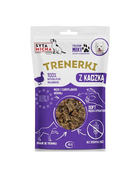 Treningówki pre psa z kaczkou. Sú produktom monobielkovinovým, ideálnym pre psov s alergiou. Obsahujú vitamíny A, C a E na posilnenie imunity
