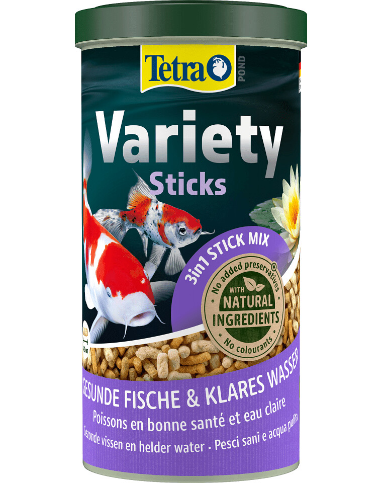Zmes troch druhov krmiva v tyčinkách, ktorá poskytuje výživnú a pestrú stravu rybičkám v záhradným jazierkach.