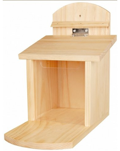 Karmnik dla wiewiórek. Wykonany z trwałego drewna, dzięki niemu jedzenie jest suche i świeże.