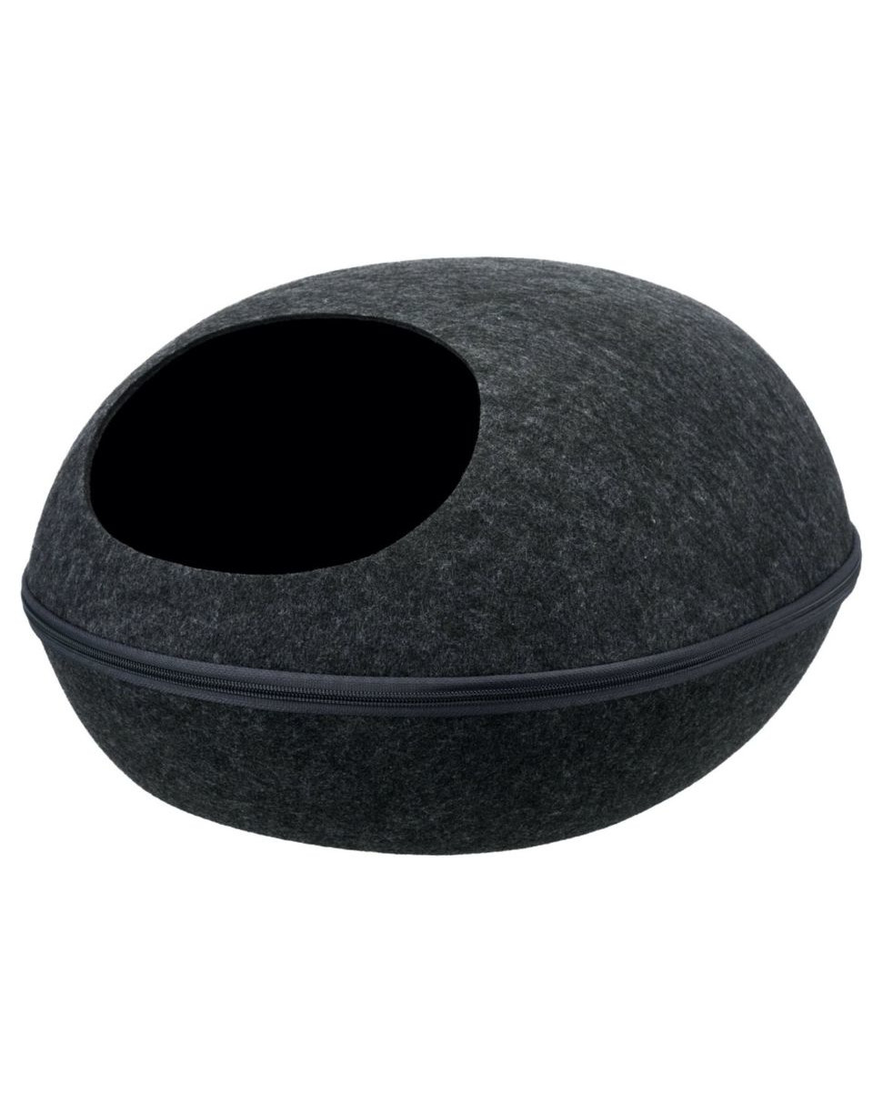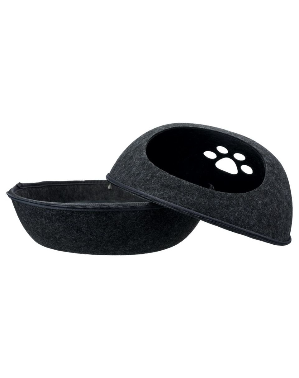 Plstené lôžko odolné voči nečistotám. Dá sa rozopnúť a vytvoriť tak otvorené alebo zatvorené lôžko. Vnútri vankúš s plyšovým poťahom a polyesterovou výplňou, ktorú možno prať.
