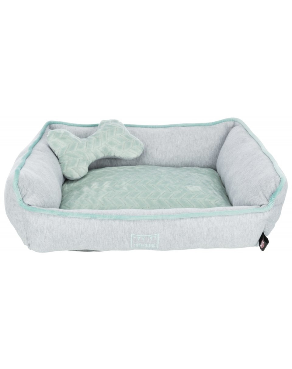 Pelech pre šteniatka z mäkkej pletenej tkaniny a plyšu. Má polyesterovú výplň. Pelech je dodávaný automaticky s hračkou – kosťou.