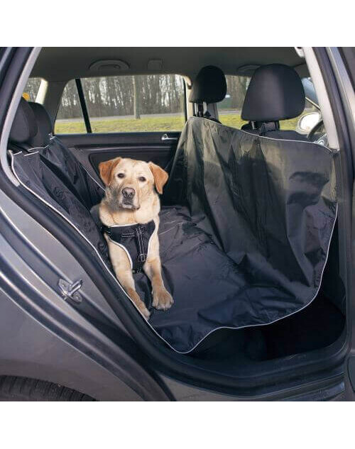 Pokrowiec na siedzenie samochodowe wykonane z poliestru Pasuje na tylne siedzenie samochodu Chroni przed brudem i sierścią Otwór na pasy pozwala zapiąć psa. Posiada klapy do mocowania oraz elementy odblaskowe.