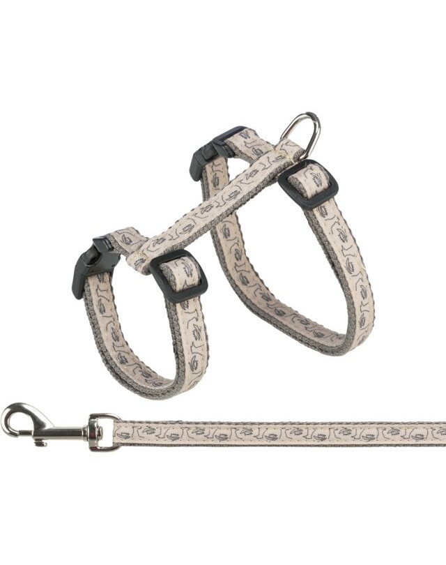 Nastaviteľný postroj pre mačky s popruhom a bezpečnostnou prackou, ktorá sa v prípade potreby ľahko otvára.