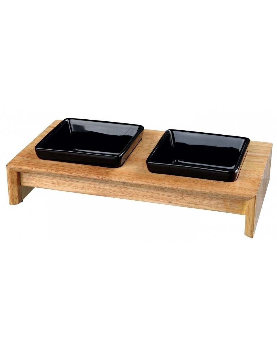 Súprava 2 elegantných keramických misiek v drevenom ráme. Stojan má gumové nožičky, ktoré zabraňujú skĺznutiu. Medzi miskami a drevom je silikón, takže misky nevydávajú žiadny hluk. Keramické vložky je možné umývať v umývačke riadu.