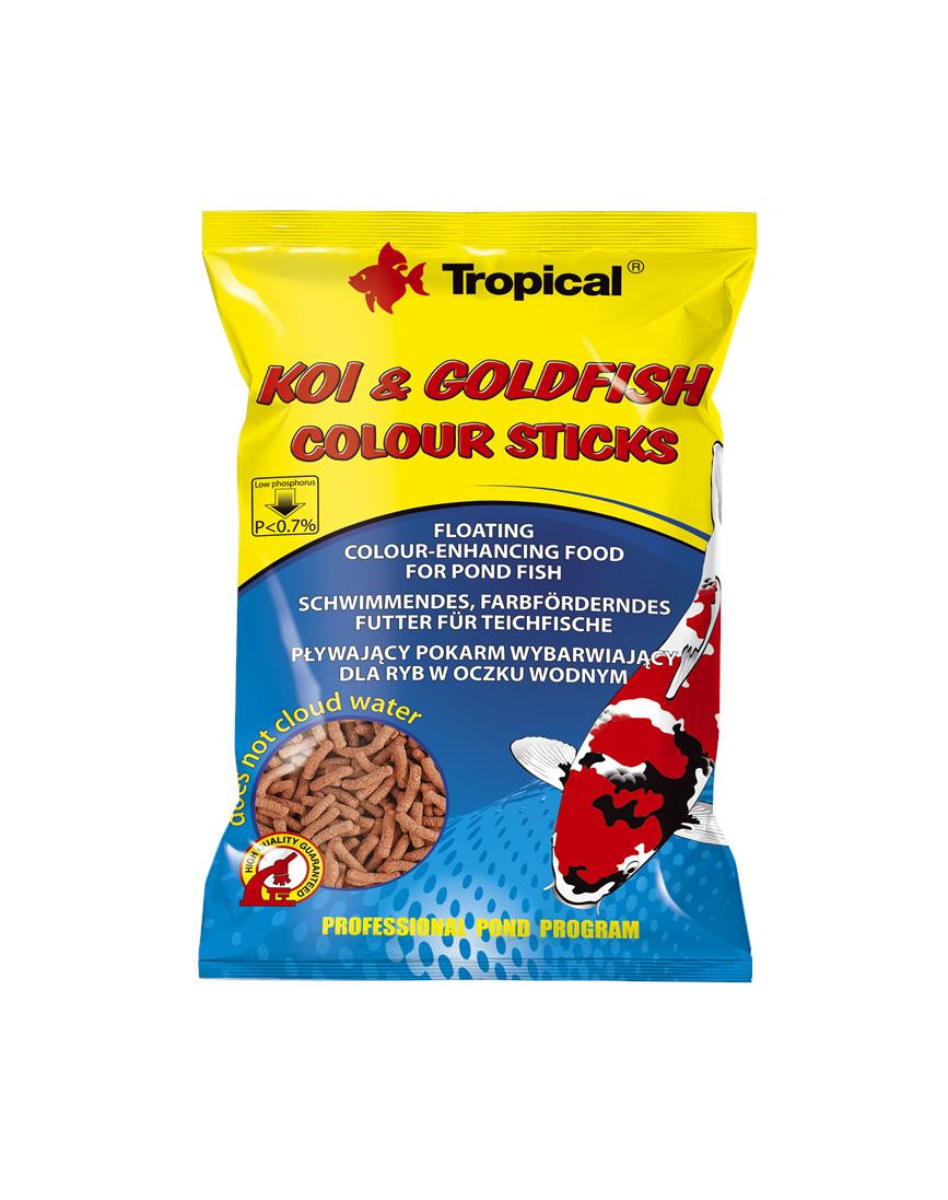 KOI & GOLDFISH COLOR STICKS je kompletné krmivo zvýrazňujúce farbu rýb chovaných v záhradných a iných jazierkach. Vďaka špeciálnej štruktúre tyčiniek sa krmivo pri kŕmení nepotápa. Pri pravidelnom podávaní výrazne zintenzívňuje červené a zlaté sfarbenie tiel chovaných rýb.