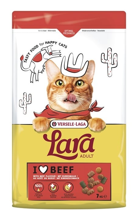 Kompletné krmivo Lara Adult with Beef bolo vyvinuté s ohľadom na dospelé mačky, ktoré milujú intenzívnu chuť hovädzieho mäsa + 2 maškrty zadarmo. Je to ideálna voľba pre mačky, ktoré žijú doma aj vonku – poskytuje energiu, podporuje kondíciu a udržuje zdravú hmotnosť.