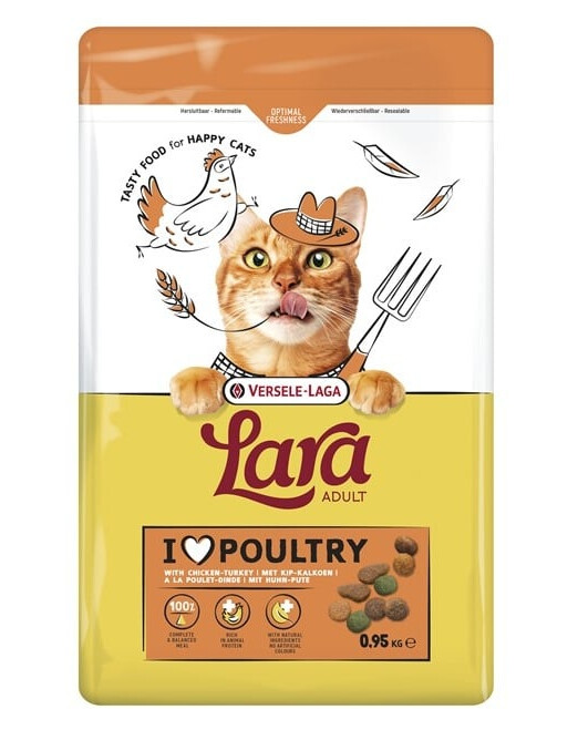 Plnohodnotné krmivo Lara Adult Turkey & Chicken je chutné granule s kuracím a morčacím mäsom, ktoré zabezpečuje dospelým mačkám zdravú, vyváženú výživu. Vyvinuté s ohľadom na domáce a vonkajšie mačky, poskytuje všetky potrebné zložky – bielkoviny, tuky, vitamíny a minerály – podporujúce vitalitu a dobrú pohodu.
