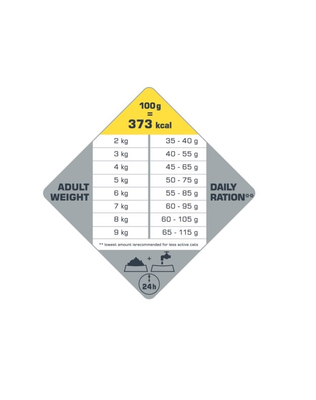 Pomáha udržiavať telesnú hmotnosť vďaka 40 % hrubých bielkovín, iba 12 % tuku a prídavku vlákniny a L-karnitínu. L-karnitín zohráva dôležitú úlohu pri spaľovaní tukov, čím pomáha udržiavať alebo znovu získať ideálnu telesnú hmotnosť.