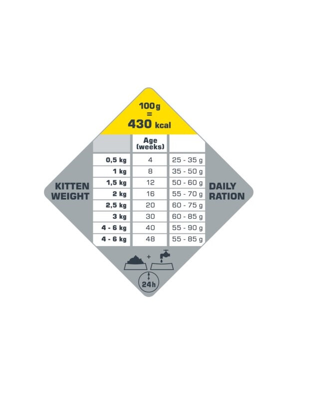 - Ideálne pre vyvíjajúce sa mačiatka, podporuje imunitu (antioxidanty) a normálnu funkciu čriev (FOS a MOS).