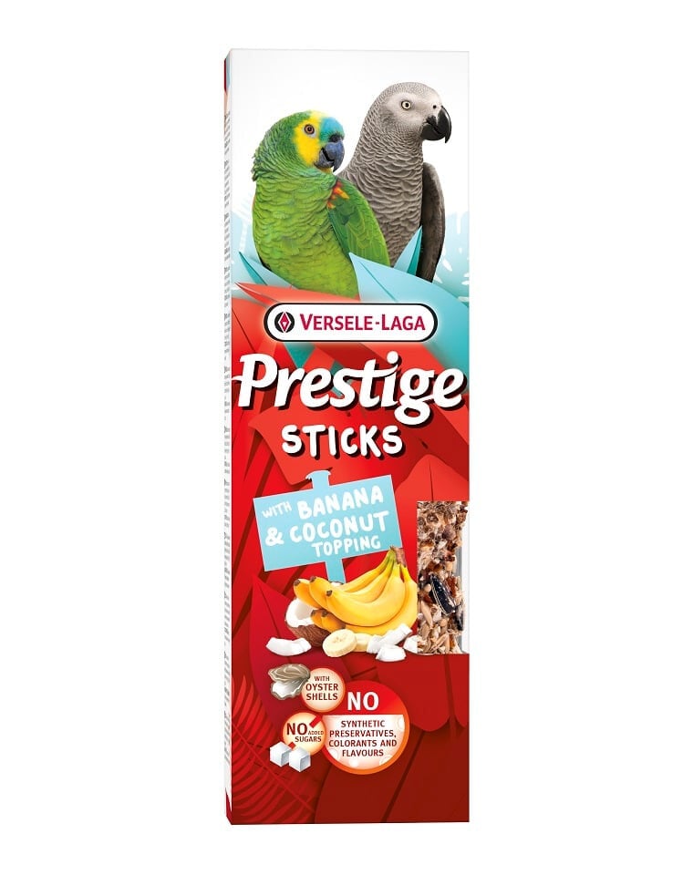 Prestige Sticks Parrots s banánovou a kokosovou polevou 140 g sú 2 extra veľké pečené banky s banánom a kokosom pre veľké papagáje. Poskytujú prirodzenú, plnohodnotnú desiatu a dopĺňajú dennú stravu.