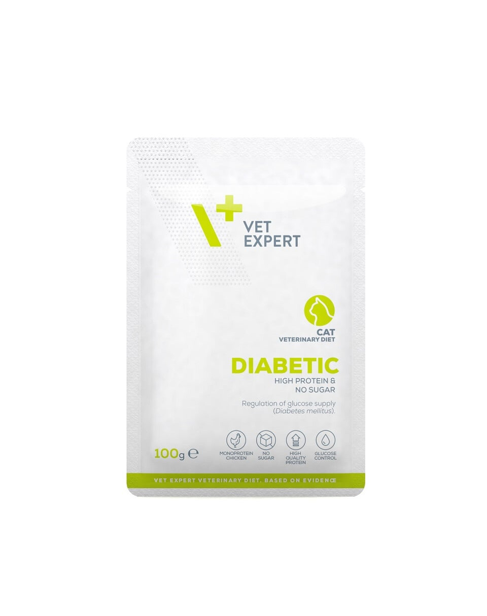 VET EXPERT Veterinary Diet Cat Diabetic je určený pre dospelé mačky s cukrovkou (diabetes mellitus). Krmivo má nízky obsah jednoduchých cukrov, disacharidov a škrobu, čo pomáha regulovať hladinu cukru v krvi. Vysokokvalitné živočíšne bielkoviny poskytujú všetky aminokyseliny, ktoré vaša mačka potrebuje.