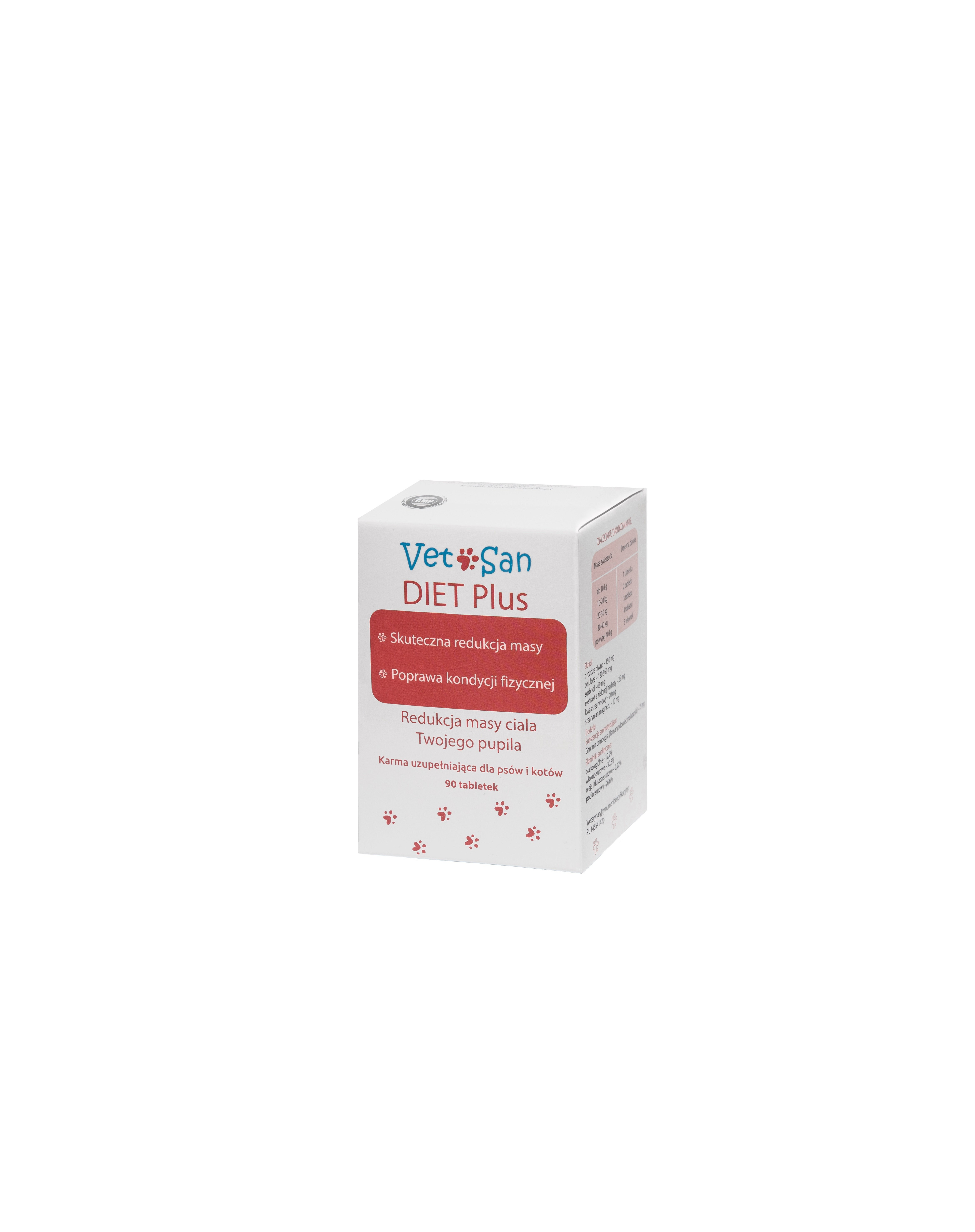 Vetosan DIET Plus rieši problémy spojené s obezitou u psov a mačiek. Je to originálna kombinácia látok, ktoré pomáhajú znižovať hmotnosť a zlepšujú stav a kvalitu života psov a mačiek.