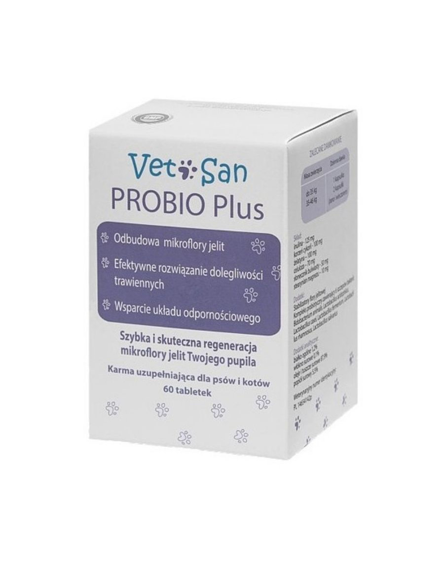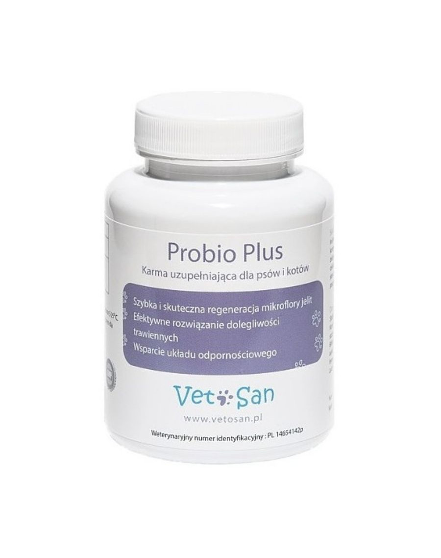 VetoSan PROBIO Plus je vyvážený komplex probiotík a prebiotík, ktorý udržuje, podporuje a rýchlo obnovuje črevnú mikroflóru po liečbe antibiotikami a inými liekmi. Je určený pre psov a mačky na udržiavanie a podporu črevnej mikroflóry, pozitívne ovplyvňuje imunitný systém a inhibuje alergické reakcie. VetoSan PROBIO Plus sa odporúča všetkým psom a mačkám, ktoré majú problémy s trávením, po liečbe antibiotikami, dysbakteróze a infekciách čriev, plynatosti, kalení a nadmernej kyseline.