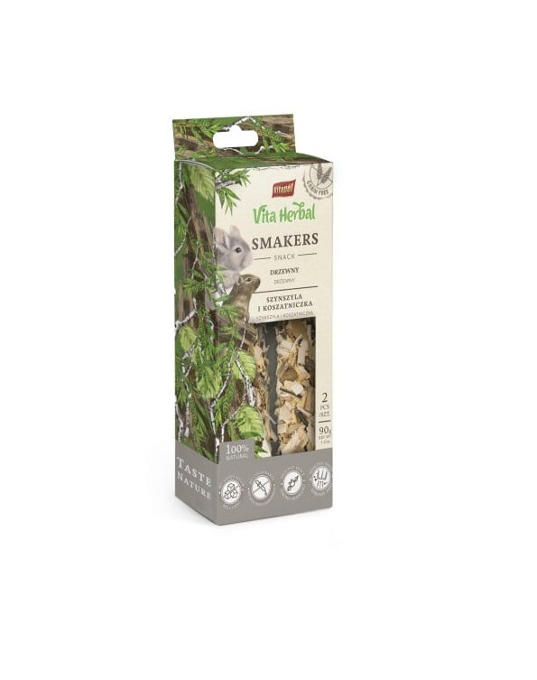 Vita Herbal Smakers je 100% bezobilná pochúťka ideálna pre činčily a morčatá. Drevo Smakers, ako už názov napovedá, pozostáva z kôry a vetvičiek listnatých stromov. Pôsobí ako prirodzený žuvací prostriedok na správne obrusovanie rezákov a tvrdá štruktúra liečiva tento proces ďalej podporuje. Okrem toho sú vetvičky a kôra vynikajúcim zdrojom vlákniny a priaznivo pôsobia na tráviaci systém zvierat, zmierňujú príznaky hnačky a črevného kataru. Smakers neobsahujú pridaný cukor ani med.