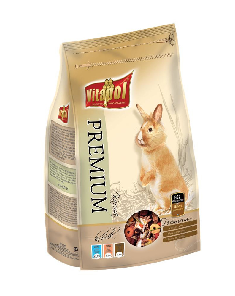 Pełnowartościowa mieszanka dla królików, waga 900gr. Karma jest odpowiednio zbilansowana,  ilość zbóż została zmniejszona na rzecz różnego rodzaju granulatów i witaminizowanych ekstrudatów. Pokarm wzbogacony jest najlepszej jakości warzywami, owocami oraz ziołami, które podwyższają poziom włókna w dawce. Por to bogactwo witamin C, A, E, B1, B2, PP oraz wapnia, fosforu, potasu, sodu, żelaza i siarki. Wpływa wzmacniająco na odporność, posiada właściwości obniżające poziom złego cholesterolu oraz stabilizuje poziom cukru we krwi. Dietetyczny seler oczyszcza organizm z toksyn, działa przeciwzapalnie, polepsza pracę serca, jest bogaty w przeciwutleniacze czyli witaminę C i E. Marchew dostarcza liczne karoteny, olejki lotne, witaminy B1, B2, B6, C, E, H, K, PP oraz wapń, żelazo, miedź i fosfor. Kora cynamonu, wierzby i lipy dba o prawidłowy proces ścierania siekaczy.