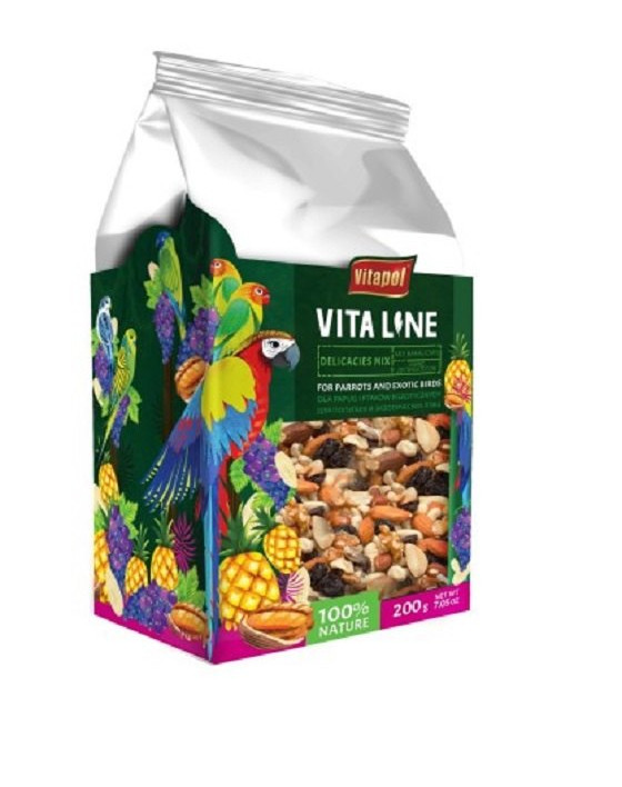 Zmes sušeného ovocia a orechov bez arašidov je vynikajúcou pochúťkou pre mnohé exotické vtáky.