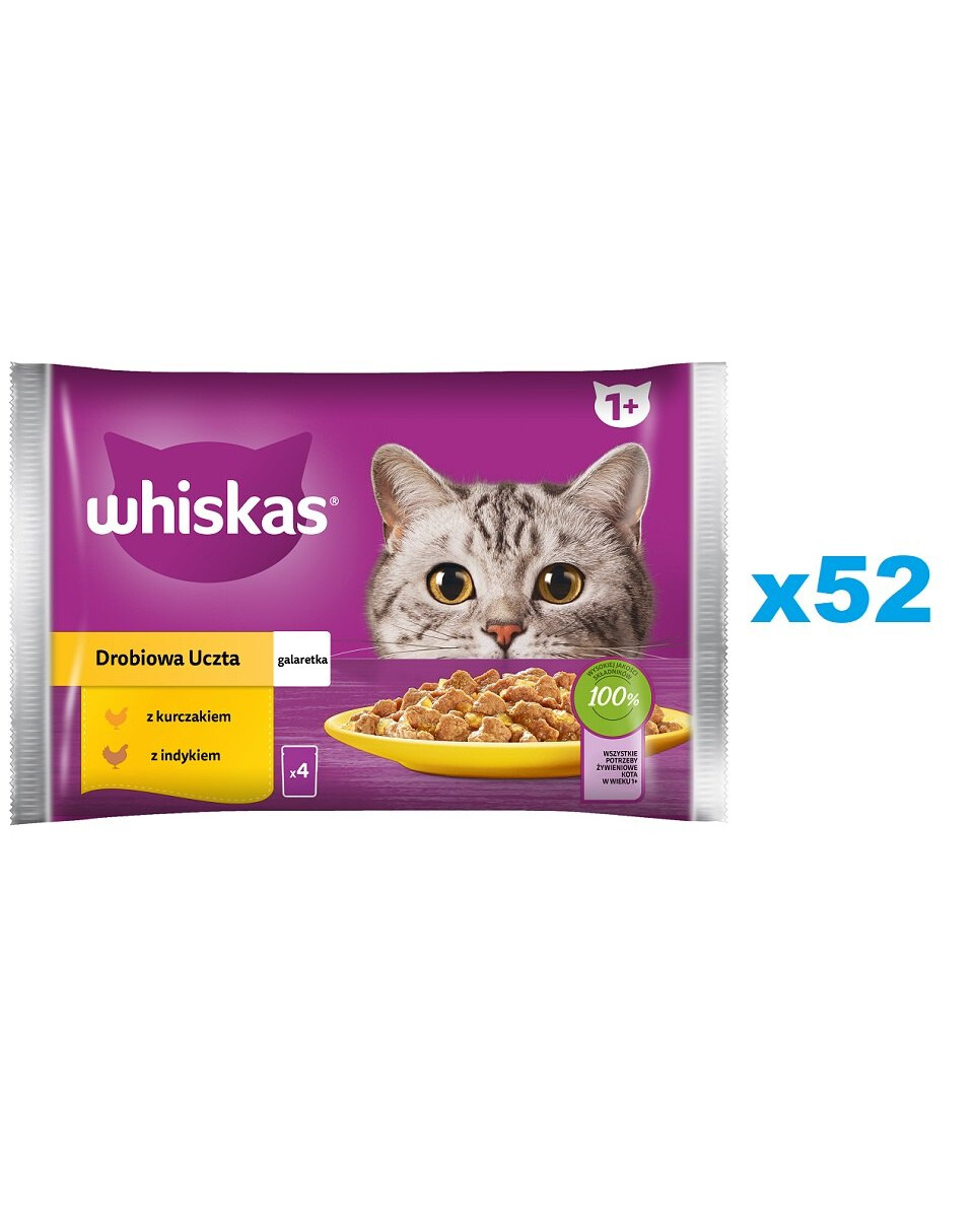 Naše krmivá Whiskas Poultry Jelly Feast boli špeciálne vyvinuté tak, aby si zachovali prirodzenú výživovú hodnotu a chuť vysokokvalitných surovín. Vďaka nim vaša mačka príde k miske rýchlejšie ako kedykoľvek predtým! Vášmu mačaciemu priateľovi bude chutiť jeden z dvoch variantov: kúsky s kuracím mäsom a s morčacím mäsom. Toto chutné krmivo v praktickom vrecúšku obsahuje zinok na podporu zdravia kože a srsti, zatiaľ čo správna rovnováha minerálov pomáha starať sa o močové cesty vašej mačky. Od hravého mačiatka až po očarujúcu dospelú mačku - naše chutné receptúry sú navrhnuté tak, aby mačky všetkých vekových kategórií spokojne vrneli nielen pri jedle.