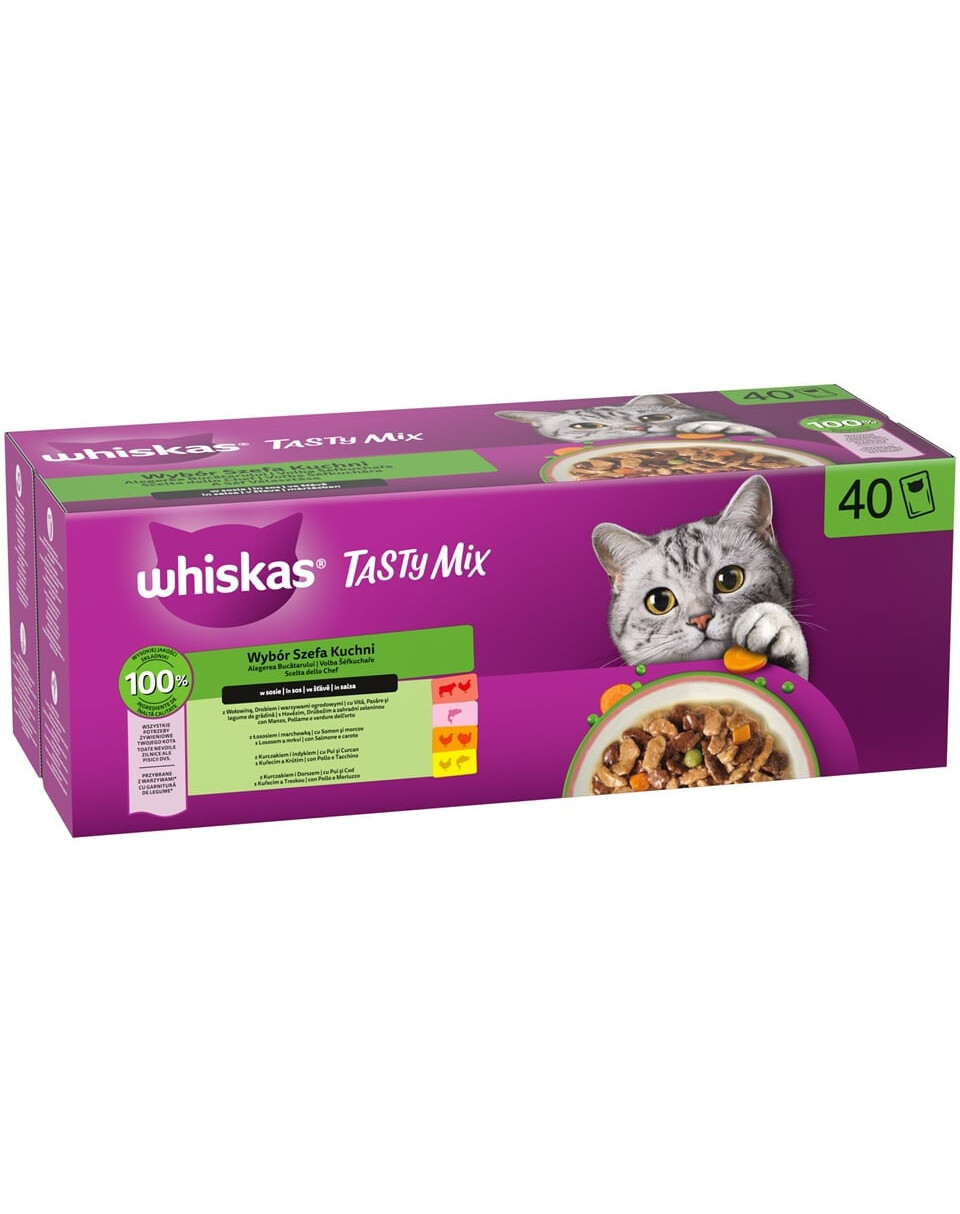 WHISKAS Adult Tasty Mix Výber šéfkuchára 40×85 g je kompletné mokré krmivo pre dospelé mačky v omáčke. Sortiment WHISKAS bol vytvorený tak, aby prinášal maximum pradenia – počas jedla aj mimo neho. Každá receptúra je starostlivo pripravená s cieľom zachovať prirodzené výživové hodnoty a lahodnú chuť kvalitných surovín, vďaka čomu vaša mačka s radosťou pribehne k miske.
