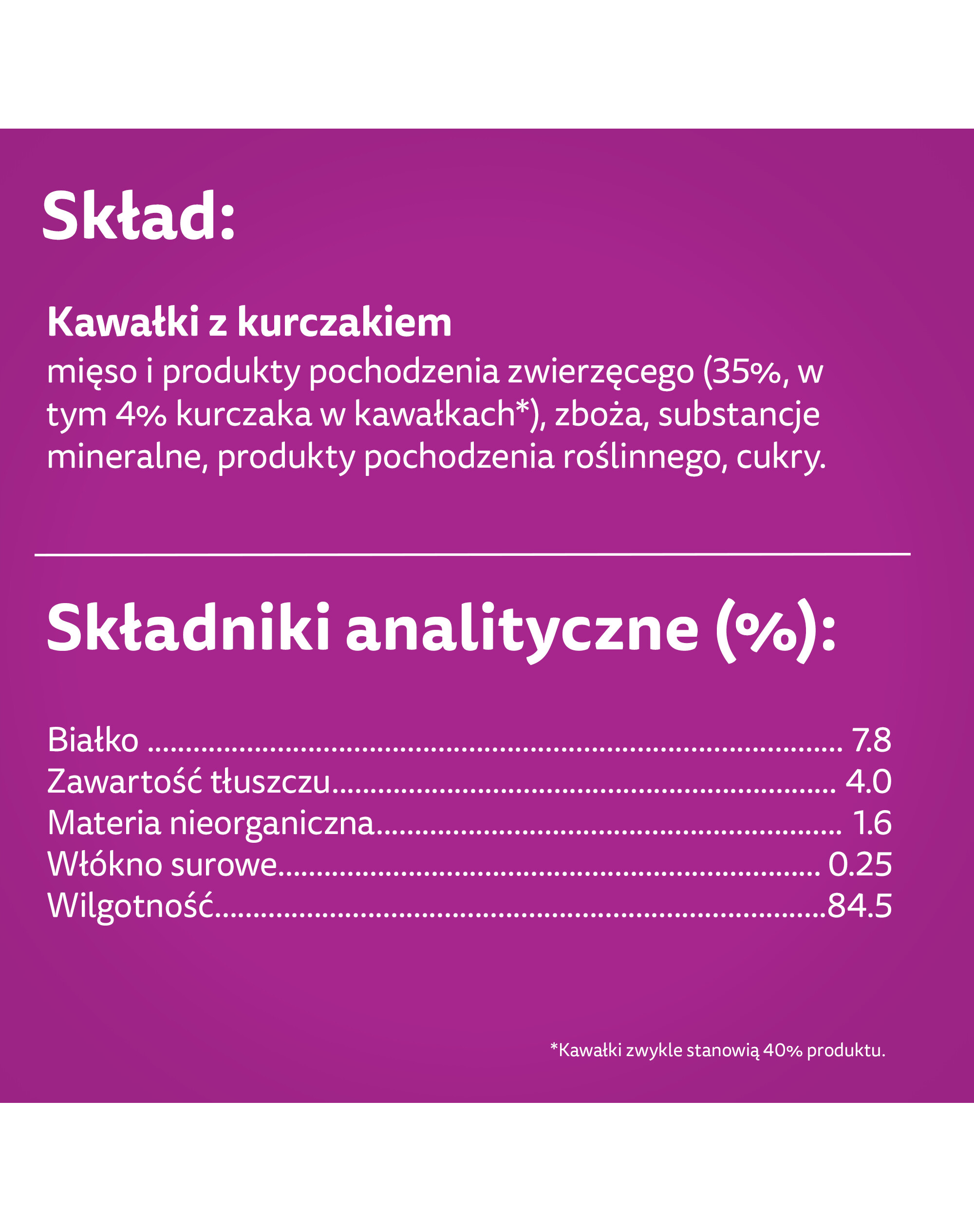 Naše krmiva Whiskas Jelly Chicken boli špeciálne vyvinuté tak, aby si zachovali prirodzené výhody a chuť vysokokvalitných surovín. Vďaka nim vaša mačka príde k miske rýchlejšie ako kedykoľvek predtým! Toto chutné krmivo v praktickom vrecúšku obsahuje zinok na podporu zdravia kože a srsti, zatiaľ čo správna rovnováha minerálov pomáha starať sa o močové cesty vášho domáceho maznáčika. Naše chutné receptúry sú navrhnuté tak, aby mačky všetkých vekových kategórií spokojne vrčali pri jedle aj mimo neho, od hravého mačiatka až po očarujúcu dospelú mačku.