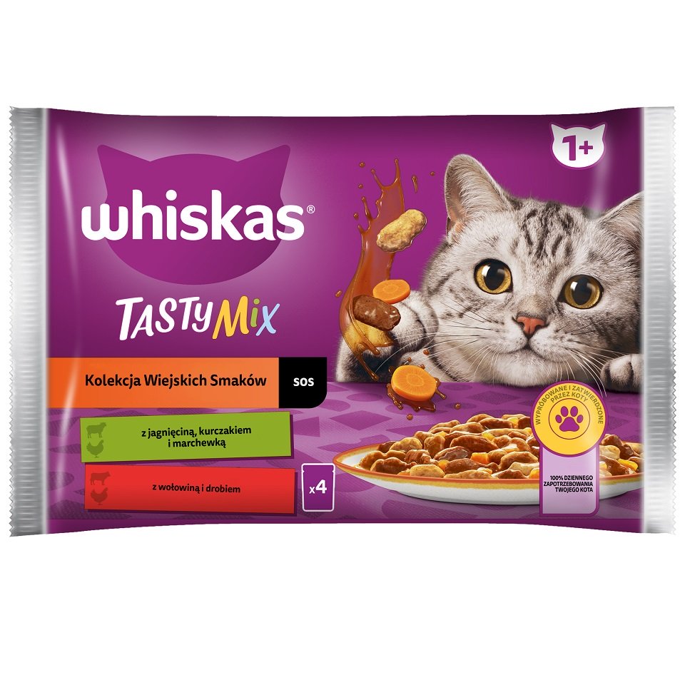 Krmivo Whiskas Rural Flavours Collection je súprava starostlivo pripravených, kompletných a vyvážených mokrých krmív pre dospelé mačky. Váš mačací priateľ si pochutná na jednej z dvoch príchutí: kúsky s jahňacím mäsom, s kuracím mäsom a mrkvou a s hovädzím mäsom a hydinou. Každý variant príchute obsahuje šťavnaté, mäsité kúsky zaliate v aromatickej omáčke, ktorých veľkosť bola špeciálne prispôsobená potrebám mačky. Toto chutné krmivo v praktickom vrecúšku obsahuje zinok na podporu zdravia kože a srsti, zatiaľ čo správna rovnováha minerálov pomáha starať sa o močové cesty vášho domáceho maznáčika. Naše chutné receptúry sú navrhnuté tak, aby mačky všetkých vekových kategórií spokojne vrčali nielen počas jedla, ale aj po ňom.