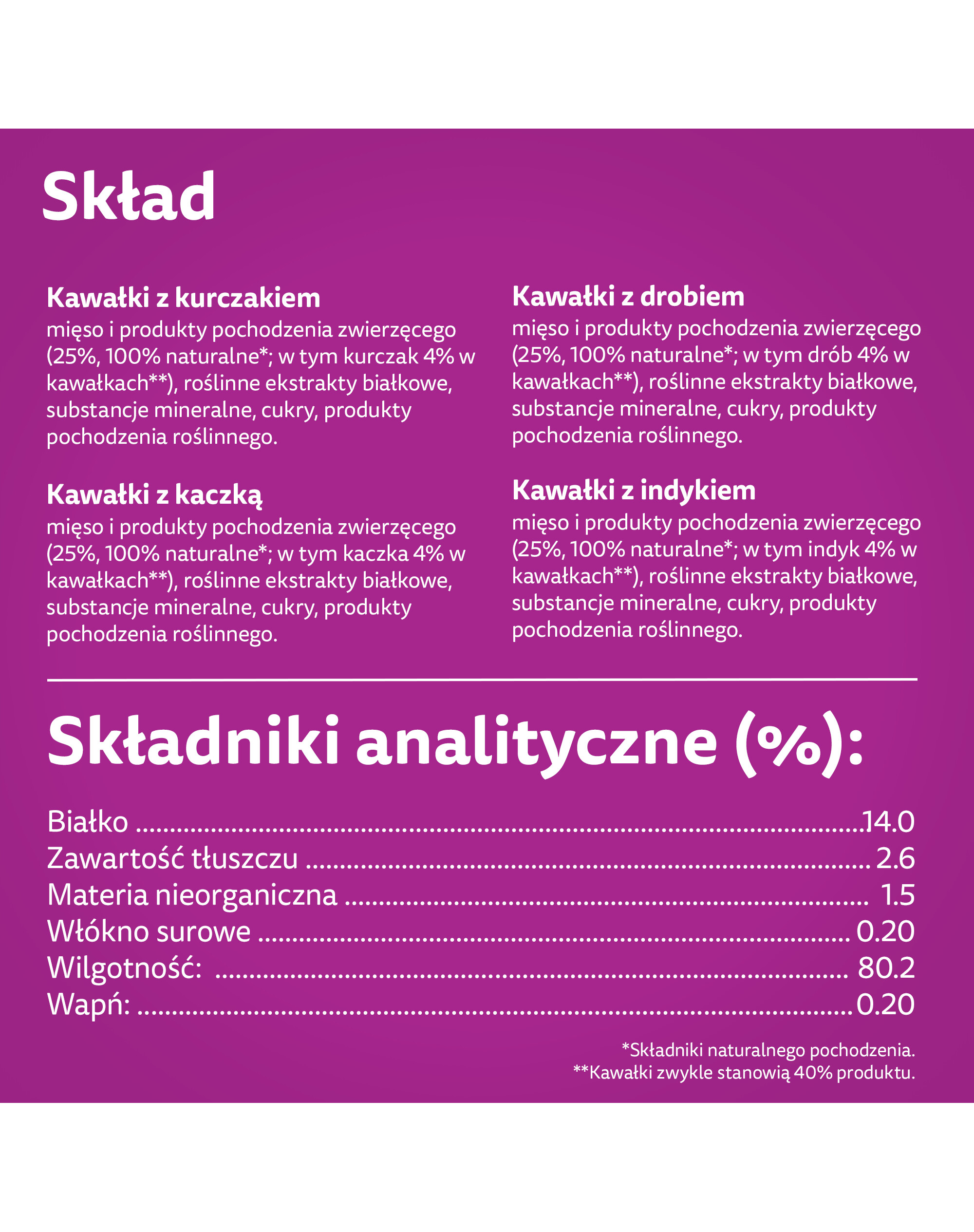 Zloženie - kúsky s hydinou: mäso a výrobky živočíšneho pôvodu (25 %, 100 % prírodné*; z toho hydina 4 % v kúskoch**), rastlinné bielkovinové extrakty, minerálne látky, cukry, výrobky rastlinného pôvodu. *Zložky prírodného pôvodu. **Kusy zvyčajne tvoria 40 % výrobku.