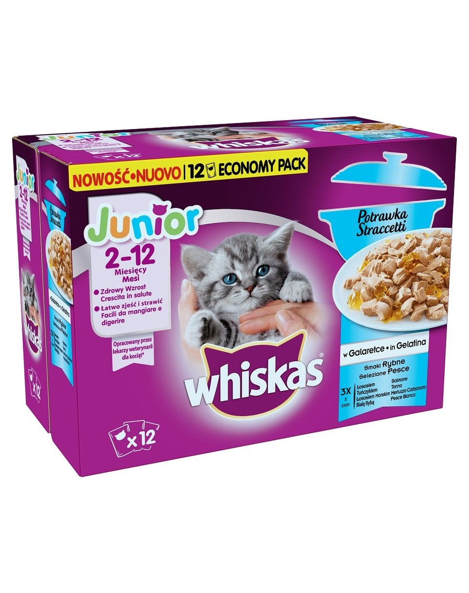 WHISKAS® Junior Casserole Fish Flavours v želé je sada vreciek v štyroch príchutiach: s lososom, tuniakom, morským lososom a bielou rybou. Každé vrecko obsahuje chutné malé mäsité kúsky jedla vložené do aromatickej želé. Vďaka tomu môžu mladé mačky ľahko uhryznúť a stráviť ich. WHISKAS® Junior Casserole Fish Flavours v želé bol vyvinutý s veterinárnymi lekármi, aby vyhovoval nutričným potrebám mačiatok. Vďaka tomu môže váš malý prieskumník od vás dostať všetko, čo je najlepšie a potrebné pre správny a zdravý vývoj. WHISKAS® Junior Kastrované rybie chute v želé sú kompletné krmivo pre mačky juniorov vo veku 2 až 12 mesiacov.