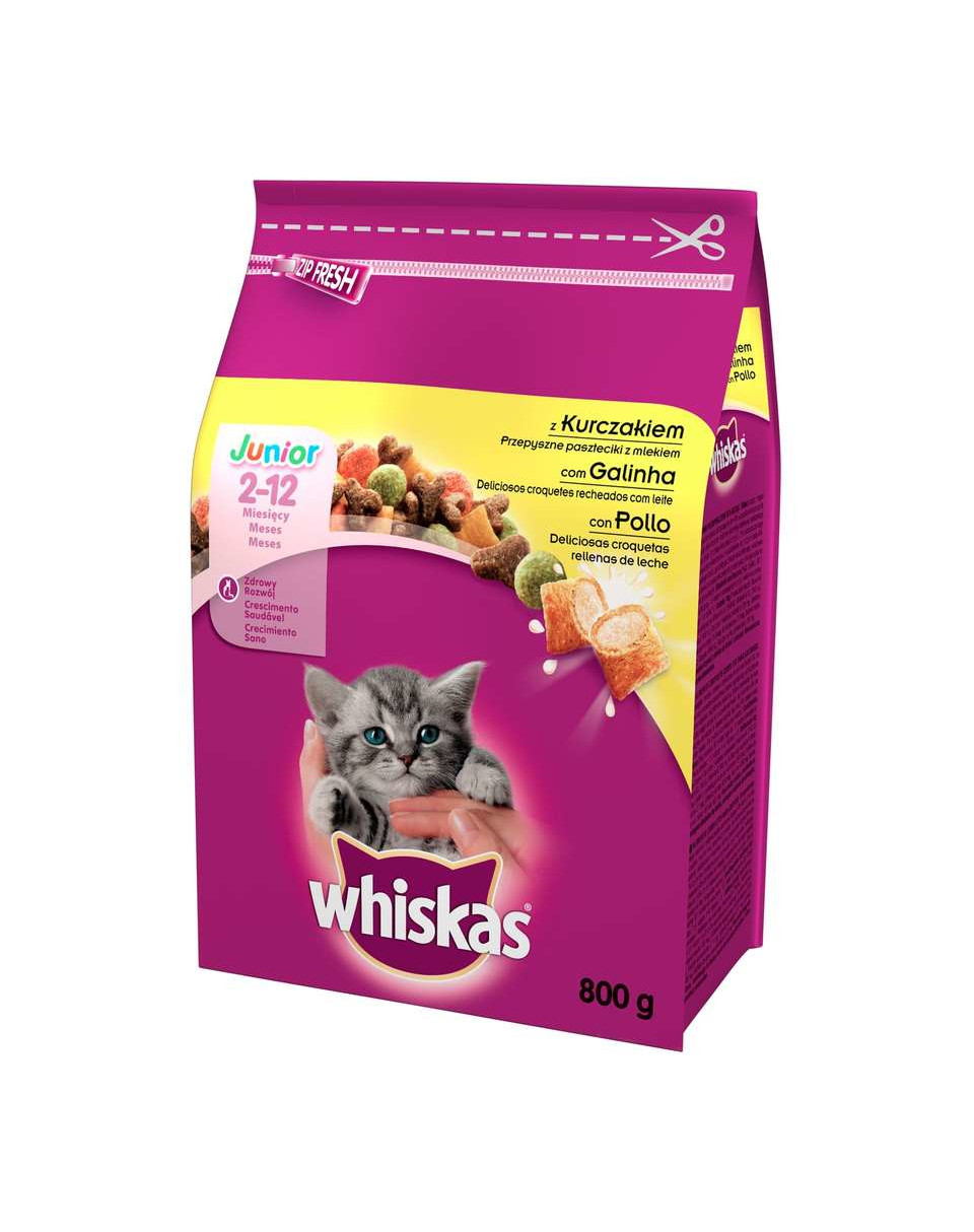 Sucha karma dla kociąt Whiskas (2-12 miesięcy) to pyszny, pełnoporcjowy pokarm, który zawiera wszystkie niezbędne składniki odżywcze, potrzebne Twojemu kociakowi dla zdrowego rozwoju. Receptura suchej karmy Whiskas Junior zawiera aż 38% mięsa i produktów pochodzenia zwierzęcego (w tym 4% kurczaka w brązowych granulkach) i została specjalnie opracowana, aby dostarczyć małemu kotu wszystko czego najbardziej potrzebuje w pierwszym roku życia. Podwyższona zawartość witaminy E i tauryny wspiera naturalny system odpornościowy, a lekkostrawny kurczak zadba o prawidłowe działanie układu pokarmowego. Zawartość wapnia zapewni Twojemu kotu zdrowy rozwój kości i zębów, a malutkie granulki będą łatwe do zjedzenia. Ponadto, dzięki ulepszonej recepturze, sucha karma dla kotów Whiskas Junior zawiera teraz prawie 2 razy więcej przepysznych pasztecików z mlekiem, które Twój kociak doceni i będzie mógł łatwo schrupać. Whiskas Junior pomoże Twojemu kotkowi wyrosnąć na zdrowego kota.